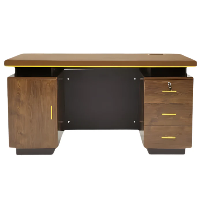 Anchor your office with a workspace that projects ultimate authority, success, and timeless craftsmanship. Combining rich, deep-toned wood grain with architectural champagne-gold fluted accents, this heavy-set executive desk is the ultimate command center for CEOs, directors, and established entrepreneurs.
