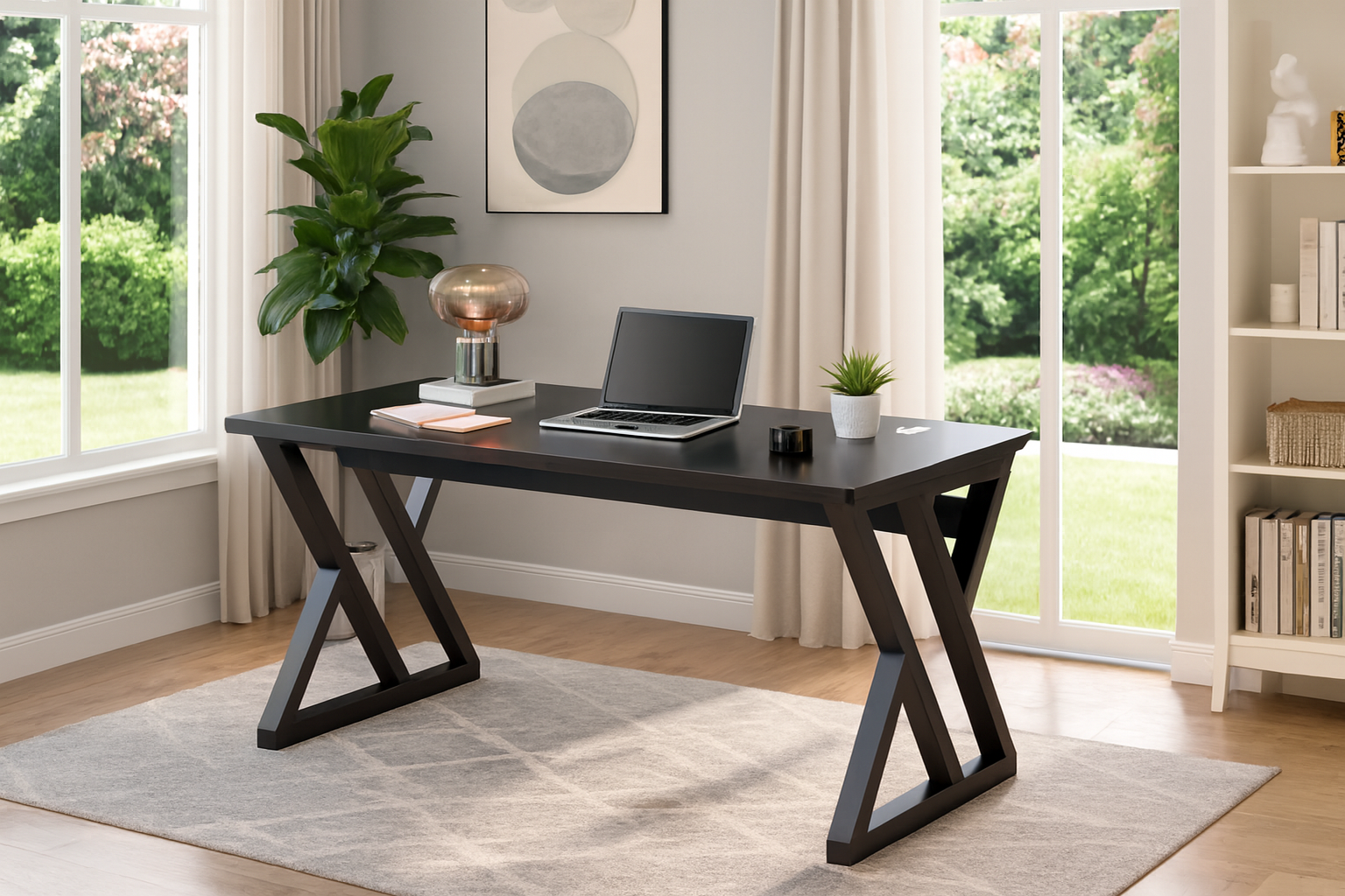 Transform your workspace with this striking Z-leg black desk, designed for professionals who value style and performance. Its bold silhouette and matte black finish create a commanding presence, while the spacious surface offers ample room for your laptop, books, and essentials. A built-in cable management hole keeps your setup clean and clutter-free, perfect for focused work or study. Whether you’re upgrading your office or curating a minimalist setup, this desk delivers both elegance and efficiency. Make a statement—your workspace deserves it.