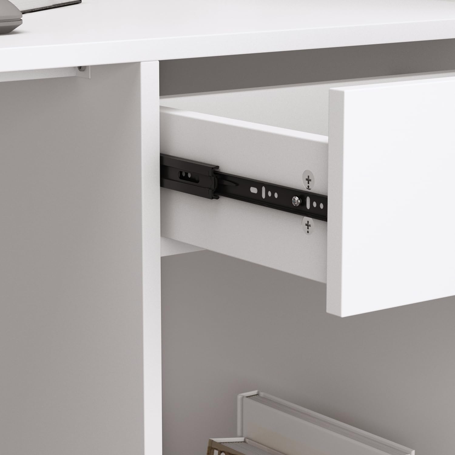 - Built-In Storage: Open shelving behind the desk provides easy access to essentials and decorative items.