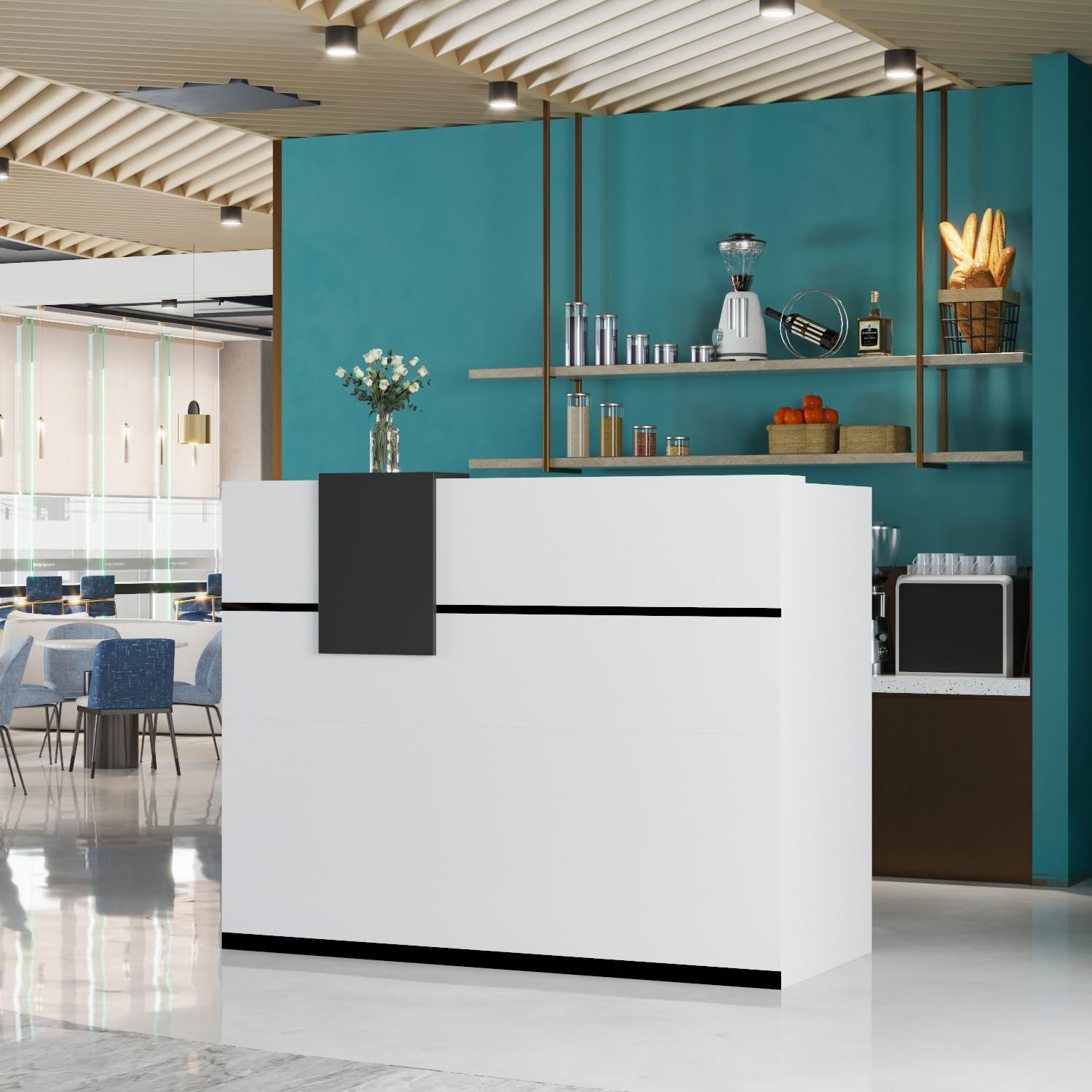 Make a lasting first impression with this contemporary reception desk, crafted to combine elegance and functionality. Its minimalist white finish accented with bold black lines creates a clean, professional look that instantly elevates any commercial or hospitality setting.
