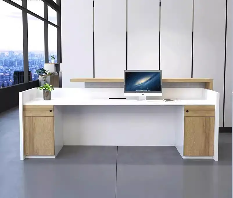 Contrasting Natural Accents: A floating, light-wood top counter adds a touch of organic warmth to the crisp white body, offering a sophisticated surface for client interactions and document signing.