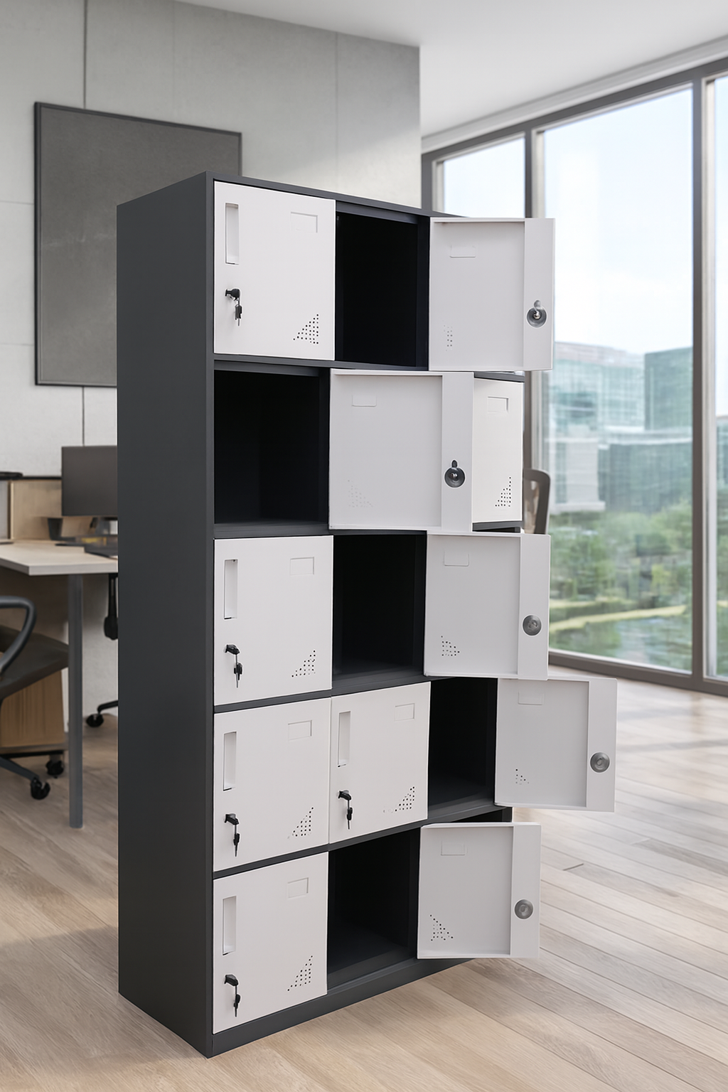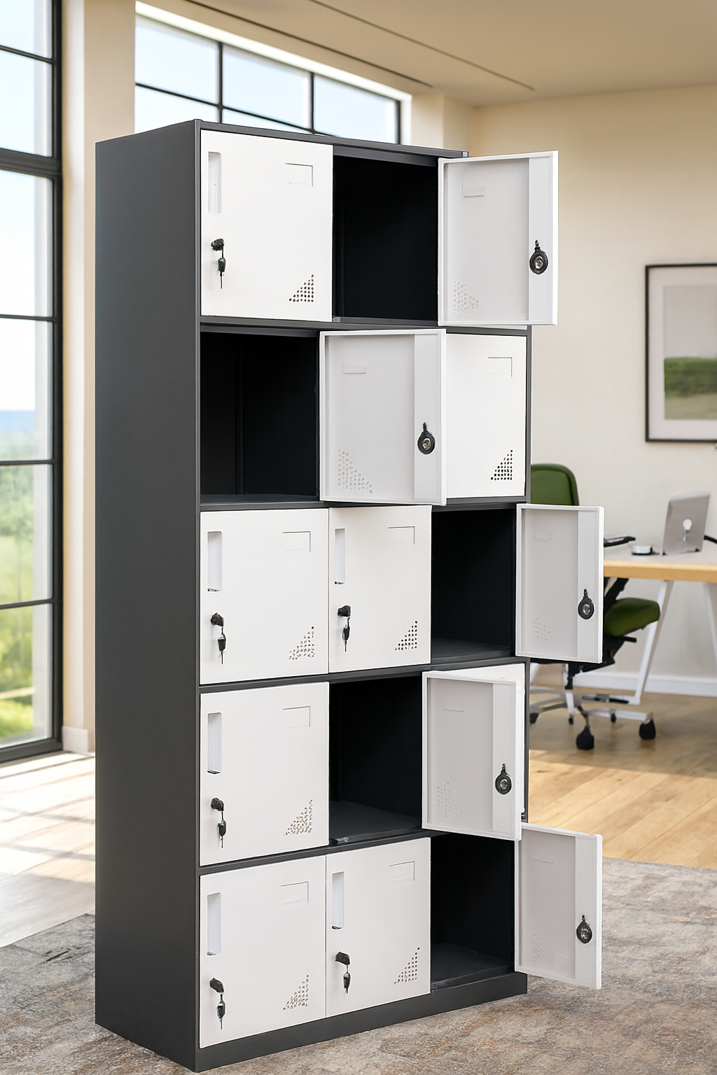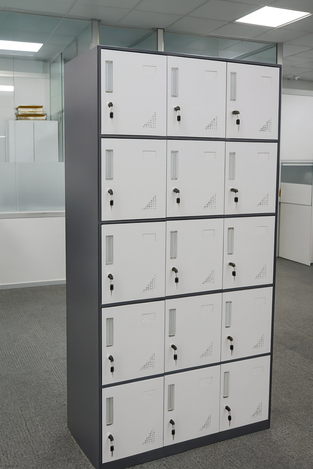 Upgrade your office storage with our 15-Door Locker Cabinet, engineered for high-capacity organization in busy professional environments. Whether you’re managing staff belongings, sensitive documents, or shared resources, this cabinet delivers unmatched functionality with a clean, modern aesthetic. Set in a modern carpeted office with glass partitions and clean lighting, this cabinet blends seamlessly into any organized workspace—offering both style and security without compromising its original design.