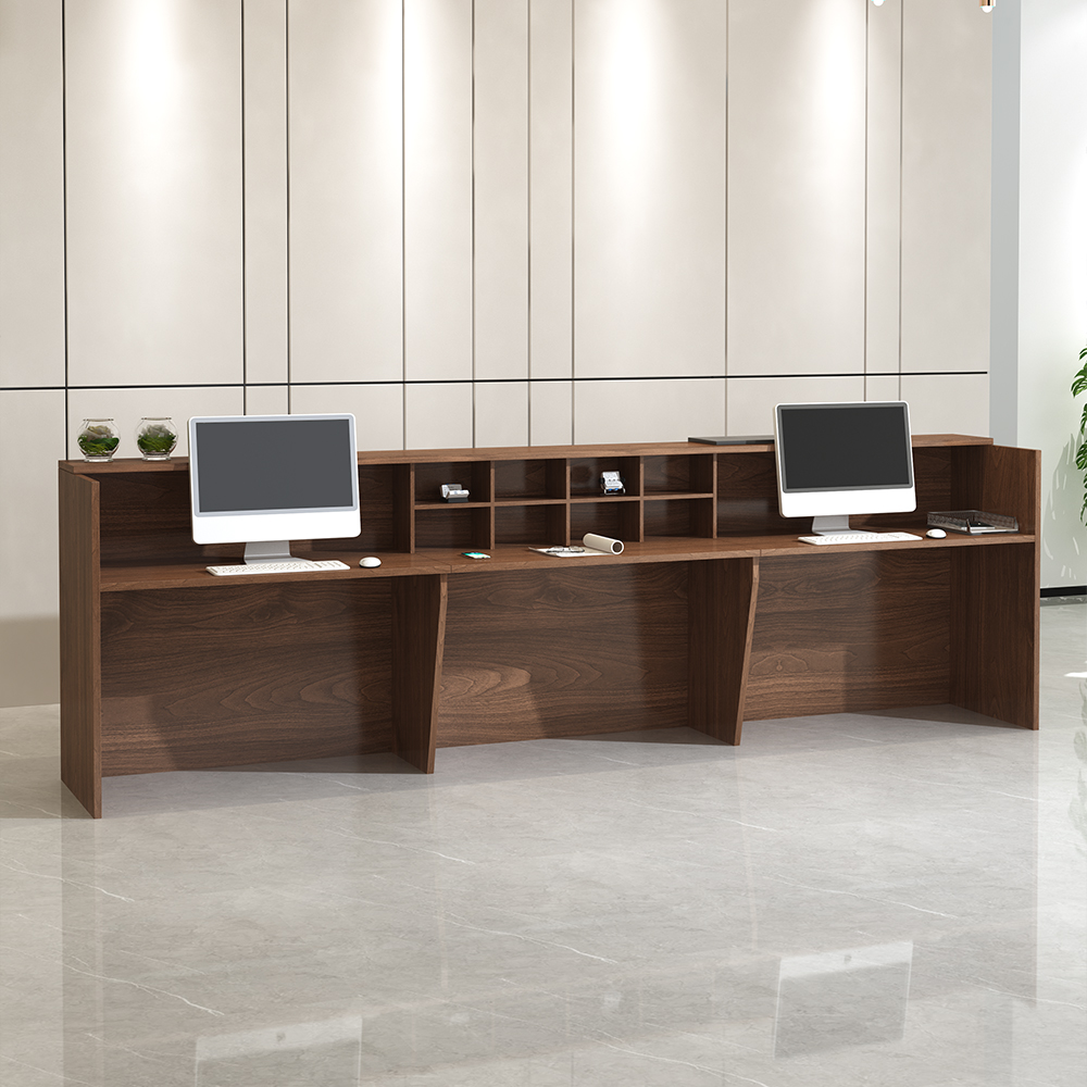 • Dual workstation setup – Ideal for busy reception areas, with space for two monitors and ergonomic seating.