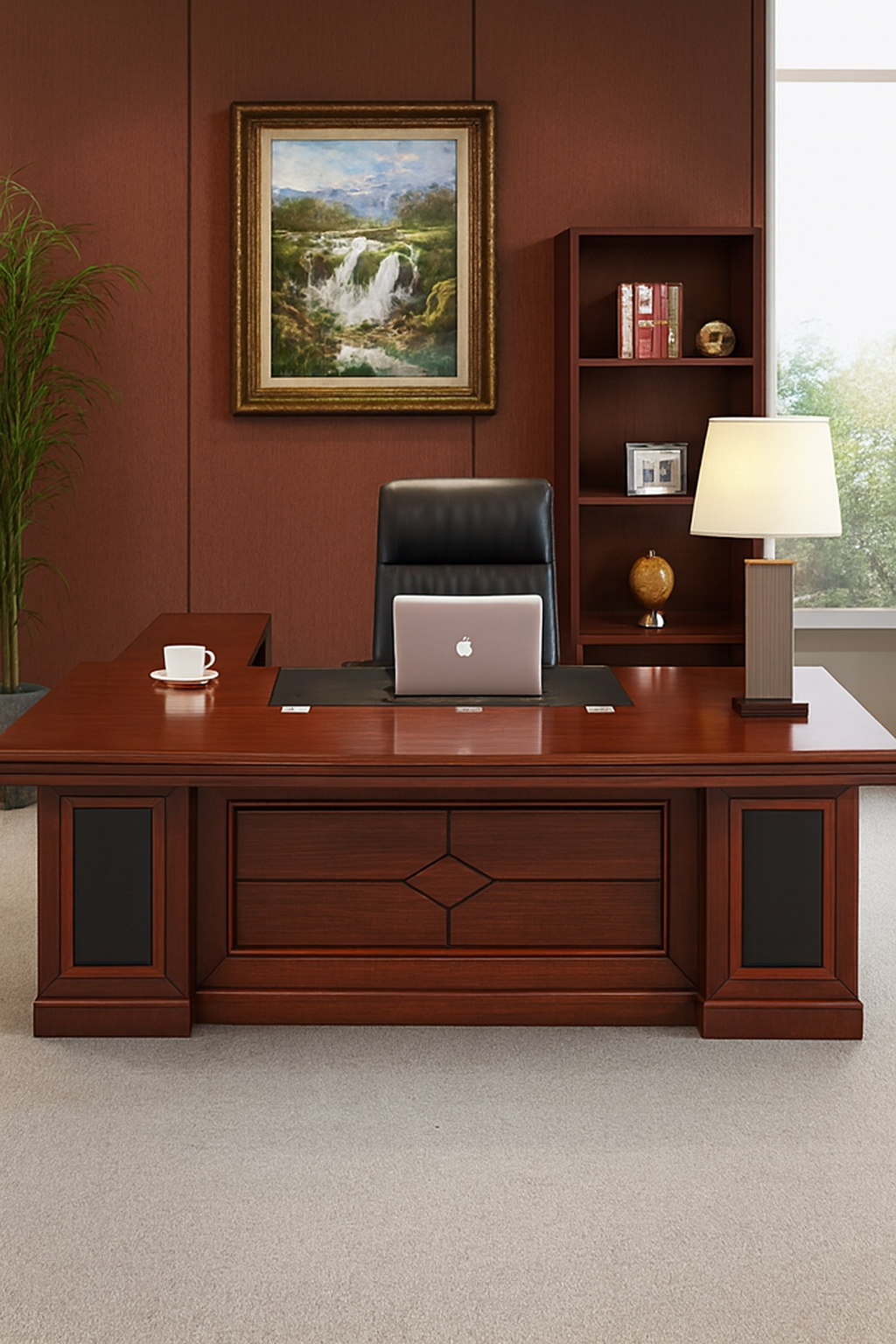 Redefine leadership in your workspace with a desk that commands respect. This expansive L-shaped executive desk is more than just a surface—it is a statement of success and traditional craftsmanship. Wrapped in a rich mahogany finish with intricate diamond-patterned detailing, it offers a grand presence for executive suites and high-end home offices.
