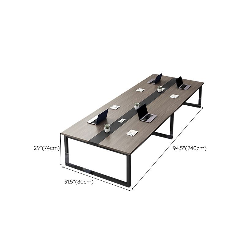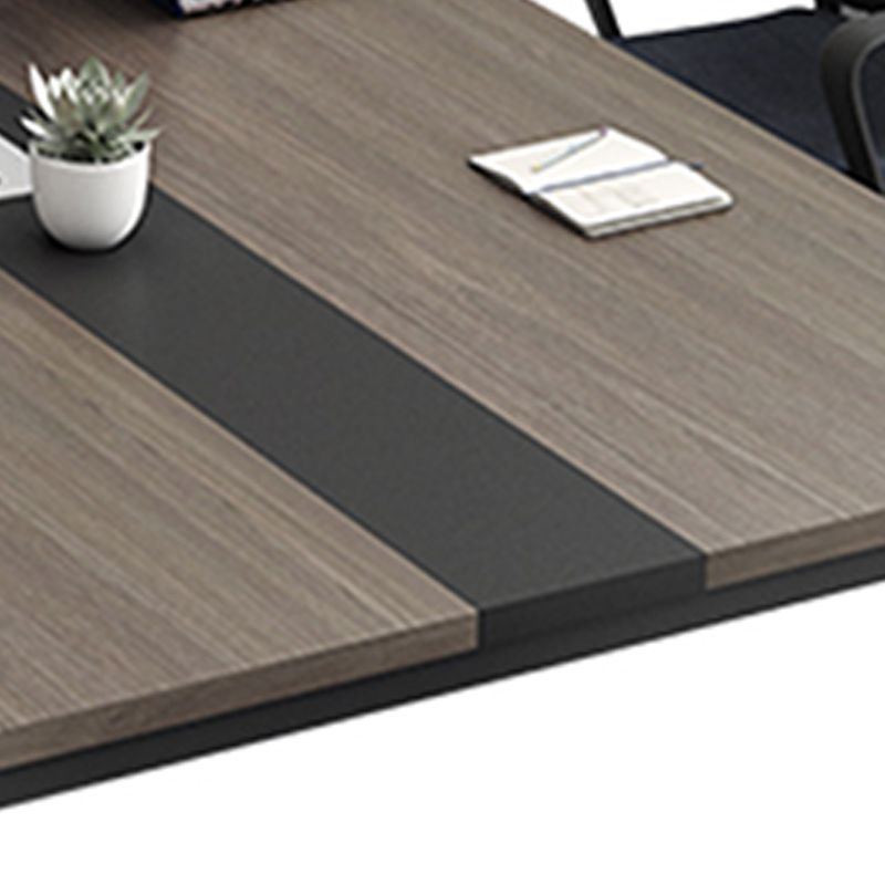 Dual-Tone Minimalist Surface: A expansive wood-grain tabletop in a professional walnut finish is intersected by a bold, central black matte inlay, creating a striking visual anchor for your meeting room.