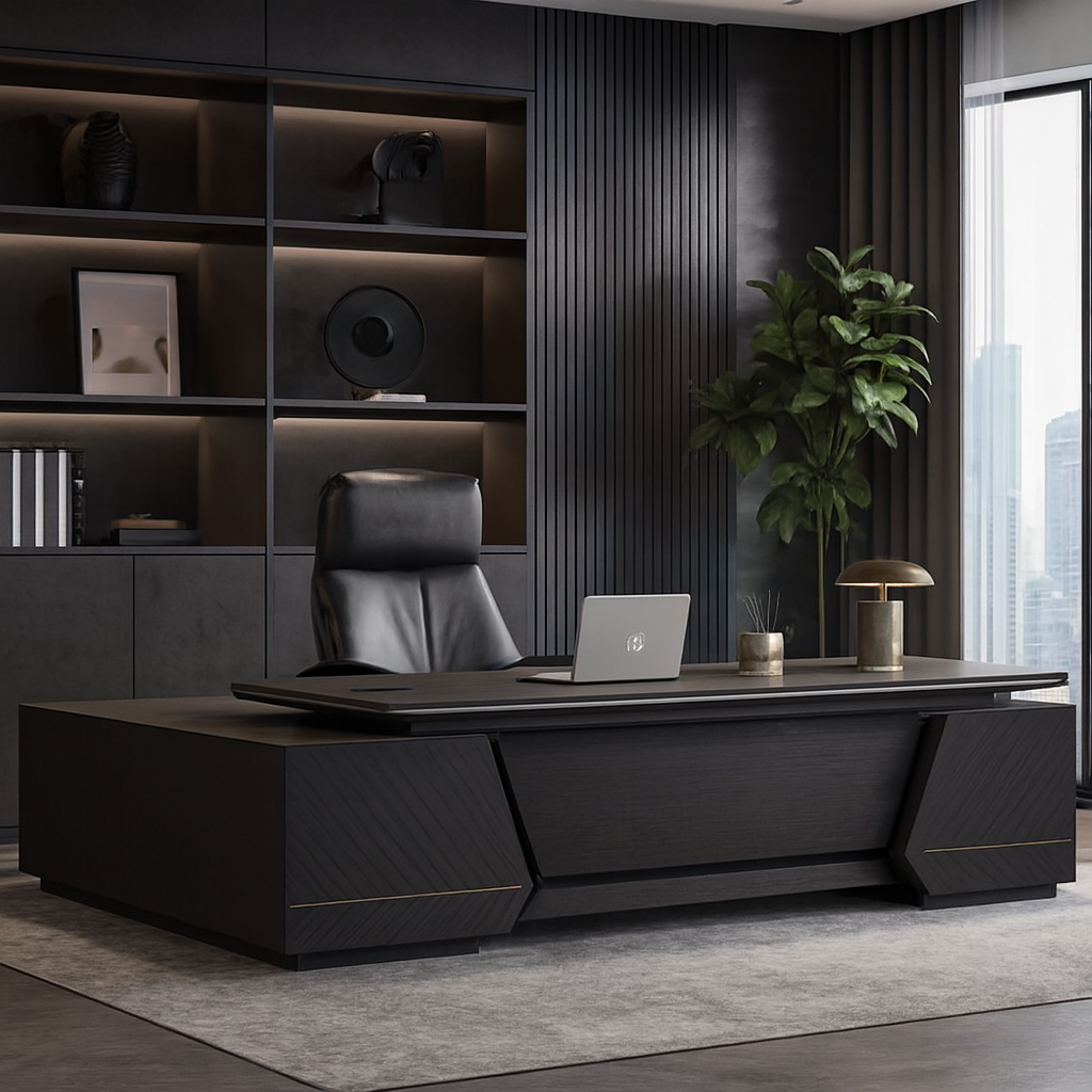 Command attention with this striking black executive desk, designed for leaders who value both style and substance. With sleek diagonal line detailing and subtle gold accents, this desk transforms any office into a space of authority and elegance. Whether you’re outfitting a CEO’s office, a law firm, or a high-end home workspace, this desk delivers a commanding presence and practical performance.