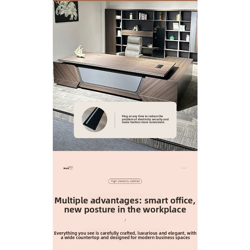 Architectural Presence: Featuring a bold, multi-layered design with deep wood grain finishes and metallic accents, this desk serves as the undeniable centerpiece of any professional office.