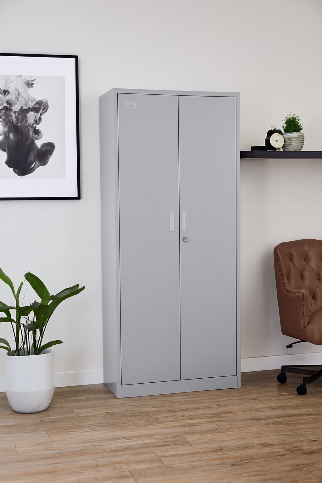 Organize your workspace with confidence using this tall metal storage cabinet, designed for durability and efficiency. Its clean light gray finish and dual-door design offer a professional look, while the lockable feature ensures your documents, tools, or supplies stay safe. Ventilation slots at the top add a practical touch, making it ideal for both office and industrial environments. Perfect for offices, workshops, schools, and commercial setups that demand reliable storage with a clean aesthetic. This cabinet keeps your essentials protected and your space clutter-free.