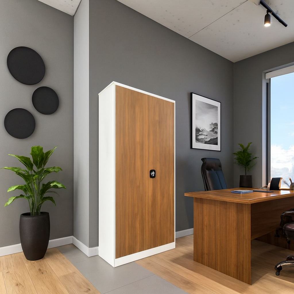 Contemporary Two-Tone Aesthetic: Features a striking contrast between a crisp white outer frame and rich, natural wood-grain finishing metallic doors for a high-end designer look.