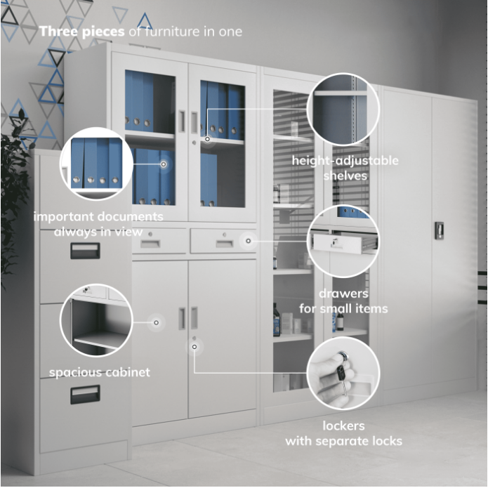 Keep your documents organized and protected with this tall metal filing cabinet, designed for modern offices that value both function and form. Featuring glass-fronted upper doors, lockable drawers, and solid lower compartments, this cabinet offers a versatile solution for storing files, supplies, and confidential materials. Ideal for law firms, clinics, schools, and corporate offices, this cabinet combines durability, security, and style—making it a smart investment for organized professionals.