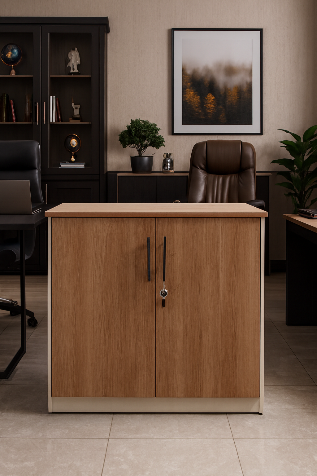 Elevate your workspace with this premium wooden storage cabinet, designed for modern offices that value both aesthetics and utility. Crafted with a sleek wood finish and accented by vertical metal handles, this cabinet blends seamlessly into executive environments, reception areas, or private offices. Whether you’re furnishing a CEO’s office or upgrading your workspace, this cabinet delivers both sophistication and practicality.