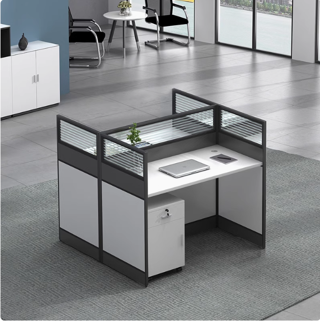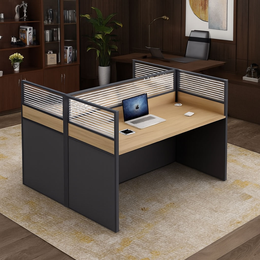 • Partition panels featuring wood and frosted glass accents—offering privacy without sacrificing openness.