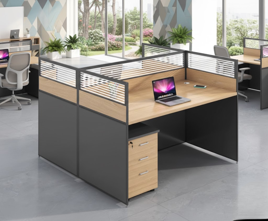 Intelligent Privacy Screens: The hybrid partition features a solid wood-grain lower panel for visual privacy and a slatted glass upper section. This allows natural light to flow through the workspace while maintaining a clear boundary for deep work.