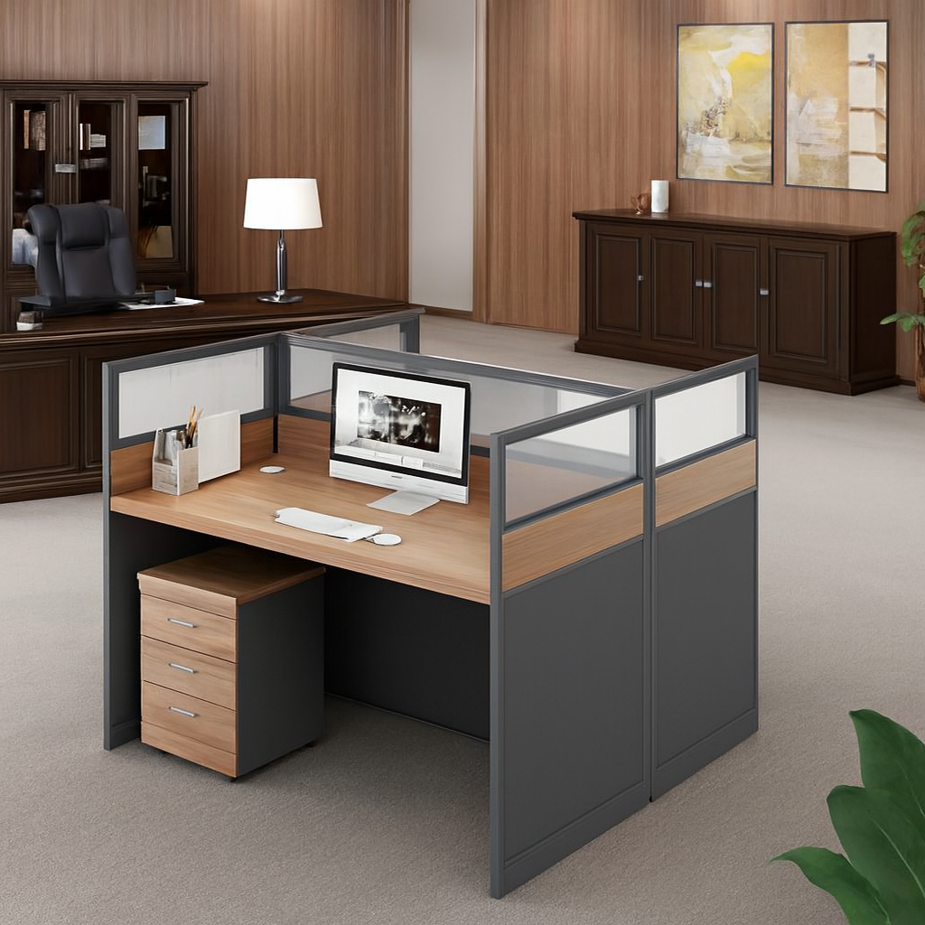 Boost productivity and elevate your office aesthetic with this contemporary cubicle workstation, designed for professionals who value privacy, organization, and style. With clean lines, glass-topped partitions, and a spacious wooden desk surface, this setup creates a focused environment while maintaining visual openness. Set against panoramic windows and accented with greenery, this workstation delivers a polished, professional vibe that impresses clients and keeps teams energized. Perfect for law firms, tech hubs, or high-end Airbnb work zones.