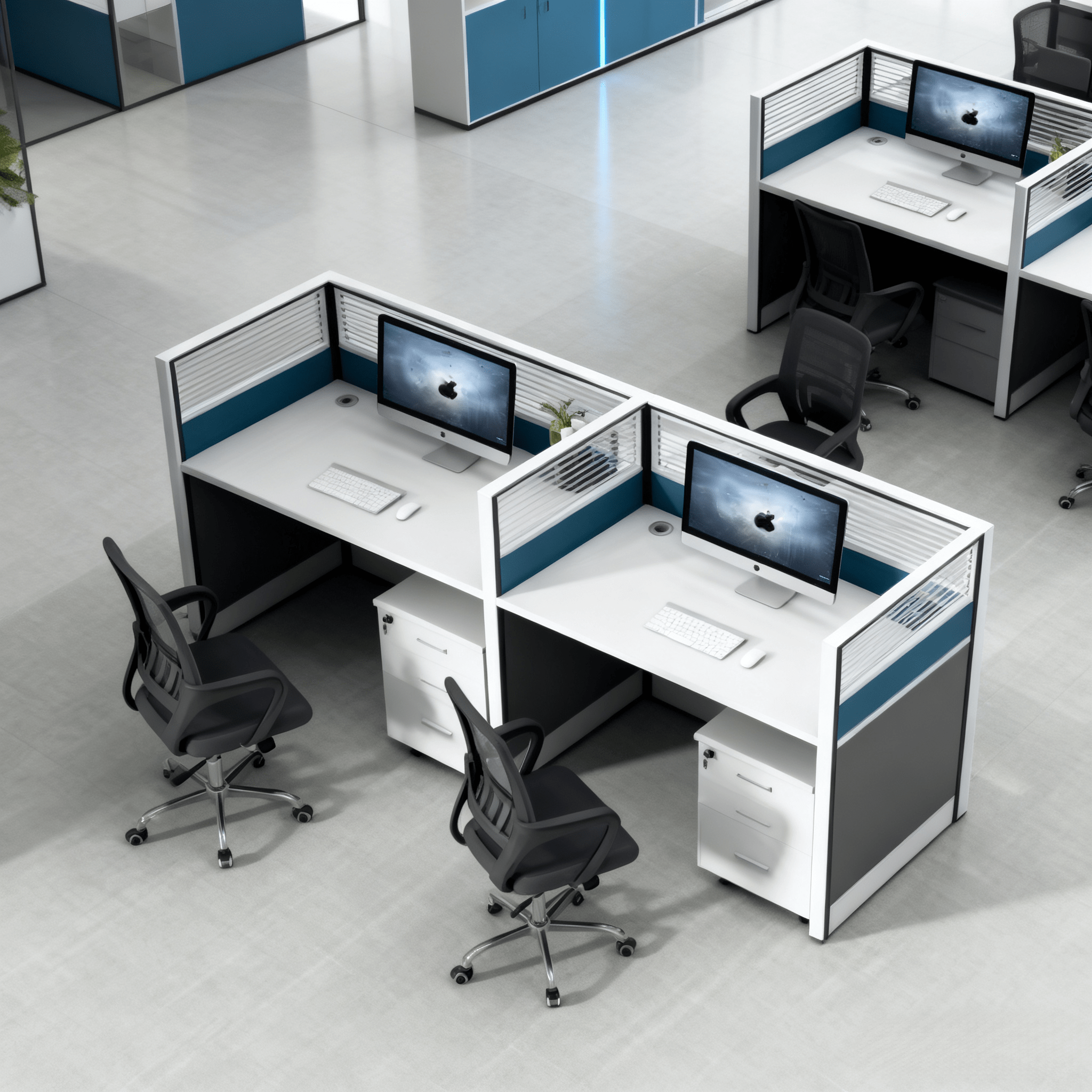 Integrated Storage Security: Each individual station comes equipped with a matching white mobile pedestal. Featuring triple-drawer capacity and a centralized locking system, it keeps personal items and sensitive documents secure.