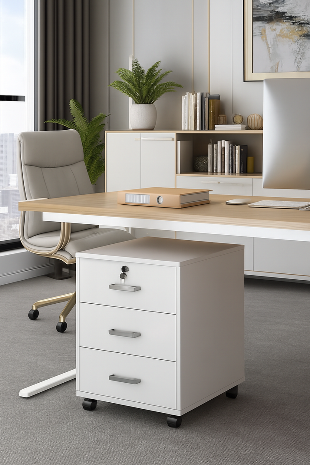 Designed for modern workspaces, the MetroLock mobile pedestal offers a seamless blend of security, style, and practicality. With three spacious drawers and a lockable top compartment, it’s the perfect solution for organizing documents, stationery, and personal items—without compromising your office’s aesthetic. Set beneath a light wood desk in a naturally lit, professional environment, this pedestal enhances both organization and visual harmony—making it a smart addition to evolving office culture.