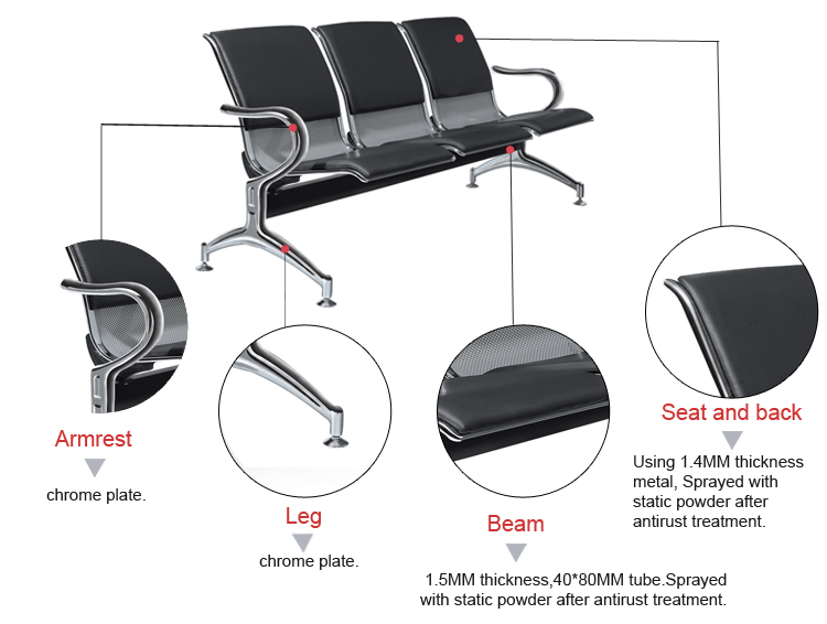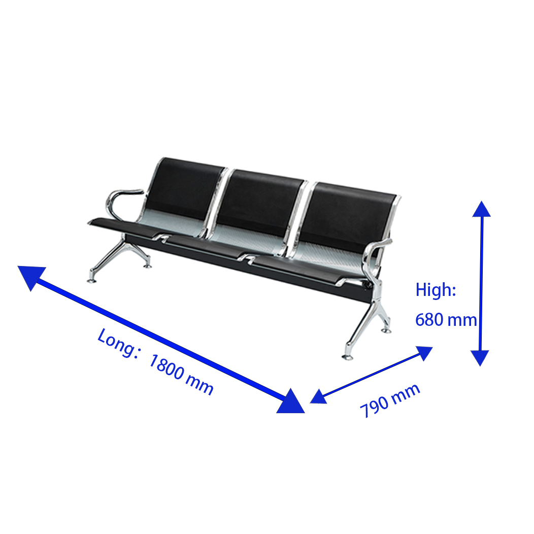 Upgrade your waiting area with this modern 3-seater metal bench — engineered for durability, comfort, and style. Featuring black contoured seats and backrests, chrome armrests, and a polished steel frame, this bench delivers a clean, professional look that suits hospitals, banks, airports, and reception zones. Built to handle constant use without compromising aesthetics, it’s the perfect blend of form and function for any public or commercial space. Make your space more welcoming with seating that speaks professionalism.