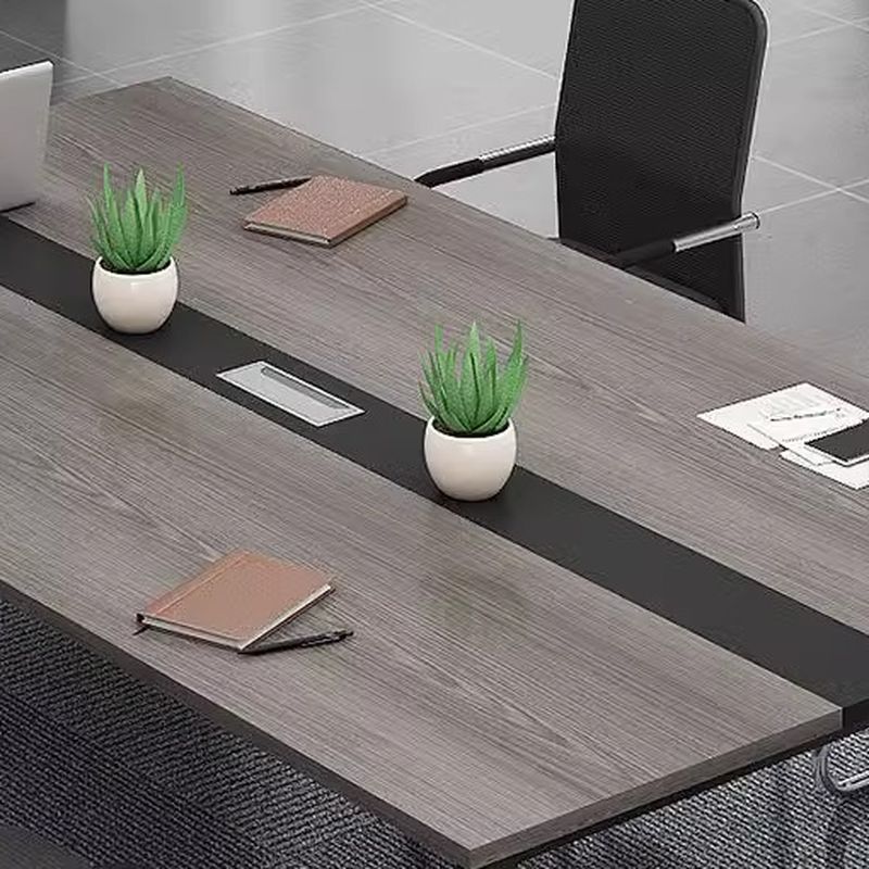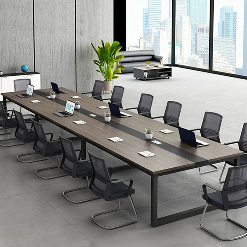 Redefine your meeting space with a table that speaks to both style and functionality. This expansive boardroom table features a stunning wood-grain finish contrasted by a sleek, midnight-black center inlay—creating a sophisticated focal point for any corporate environment. The table’s high-density surface is scratch-resistant and easy to maintain, ensuring it stands up to daily use while retaining its premium look. Its open-base design offers generous legroom for all attendees, paired perfectly here with ergonomic mesh seating(EXCLUDED)to complete the professional suite.