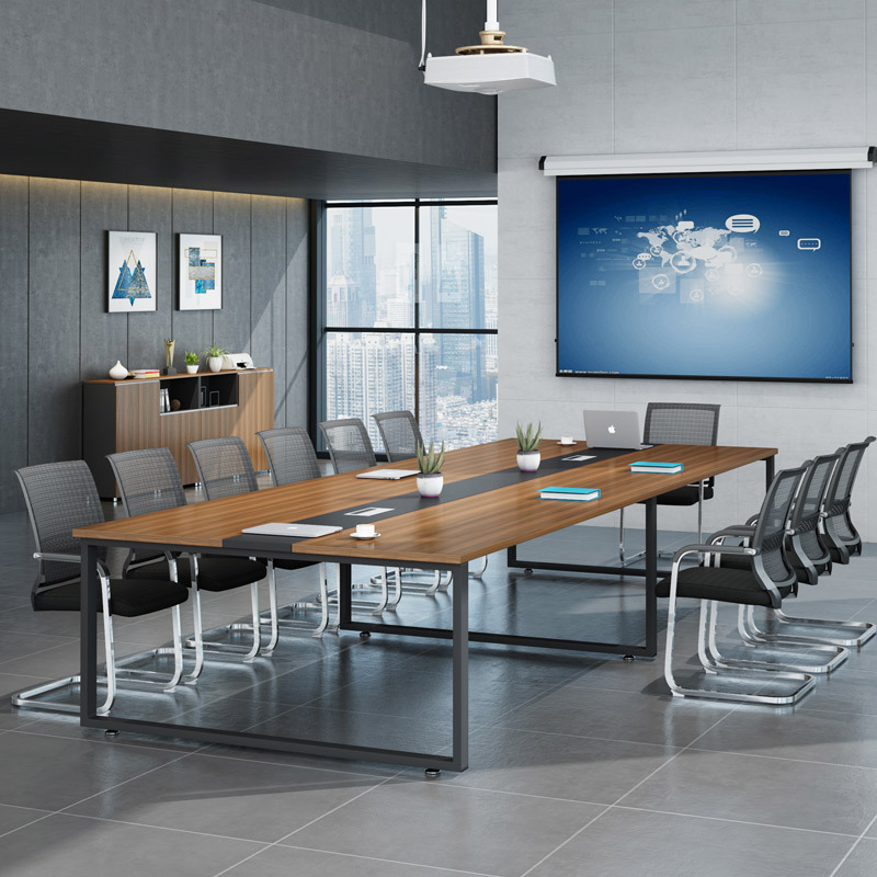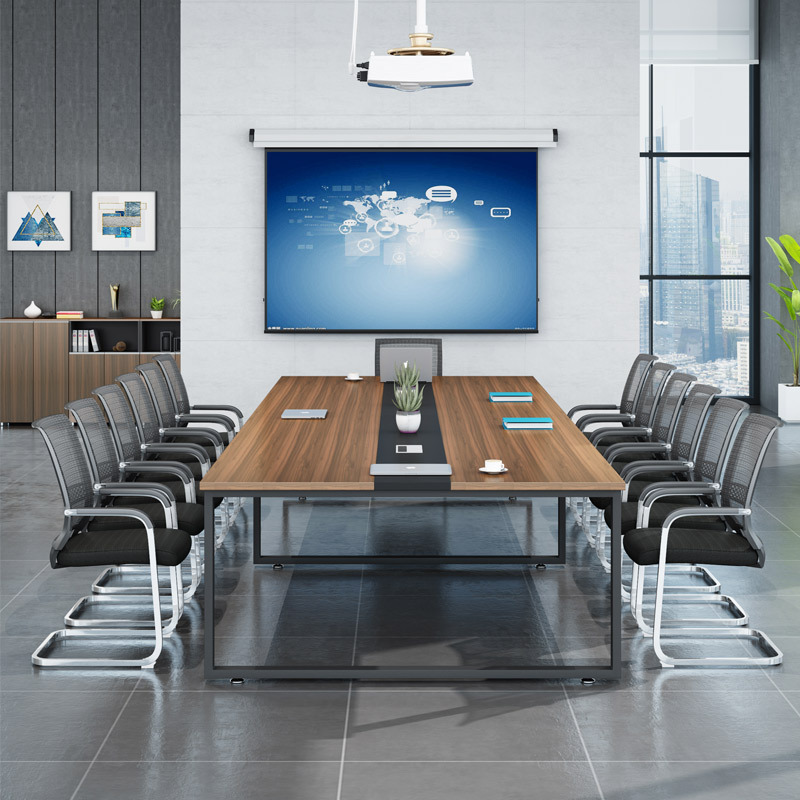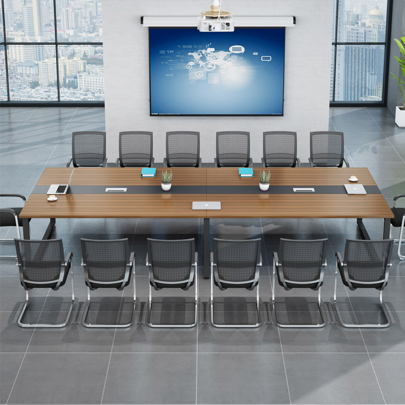 expansive Professional Surface: The extra-long tabletop features a rich, deep walnut-grain finish, providing ample space for large teams to collaborate comfortably with laptops, documents, and presentation materials.