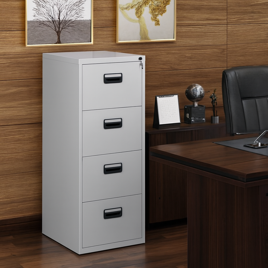 Keep your documents safe and your workspace tidy with this tall, white metal filing cabinet—designed for professionals who value both security and style. With four spacious drawers and a clean, minimalist finish, it’s the perfect storage solution for offices, clinics, schools, and home setups. Whether you’re streamlining a busy office or upgrading your home workspace, this cabinet delivers the perfect balance of function, security, and aesthetic appeal.