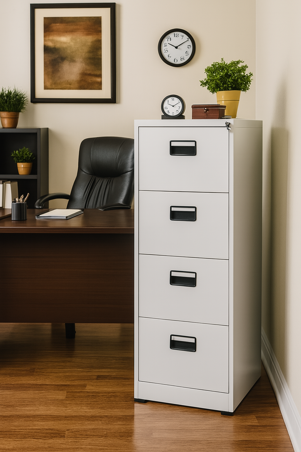Streamline your document storage with this sleek 4-drawer metal filing cabinet—built for security, durability, and everyday efficiency. Ideal for offices, schools, and government departments, it offers a clean, professional solution for organizing paperwork and confidential files. Perfect for HR departments, finance teams, and administrative offices seeking reliable, organized filing. Pair it with matching desks and shelving for a cohesive workspace.