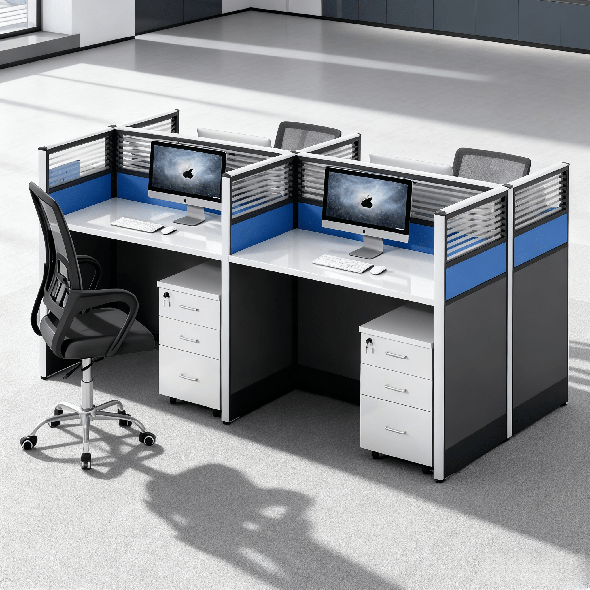 Maximize your office footprint without compromising on privacy or style. This modern 4-person workstation is the ultimate solution for growing teams that need a balance of collaboration and individual focus. Transform your open office into an organized, high-efficiency hub. Designed with a sleek white and blue aesthetic, this modular desk system provides each team member with a dedicated, professional space while maintaining a cohesive and modern look.