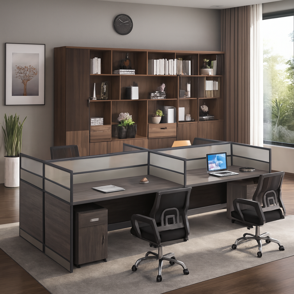 - Four Ergonomic Workspaces – Two parallel desks with individual partitions, ideal for teams, departments, or shared offices.