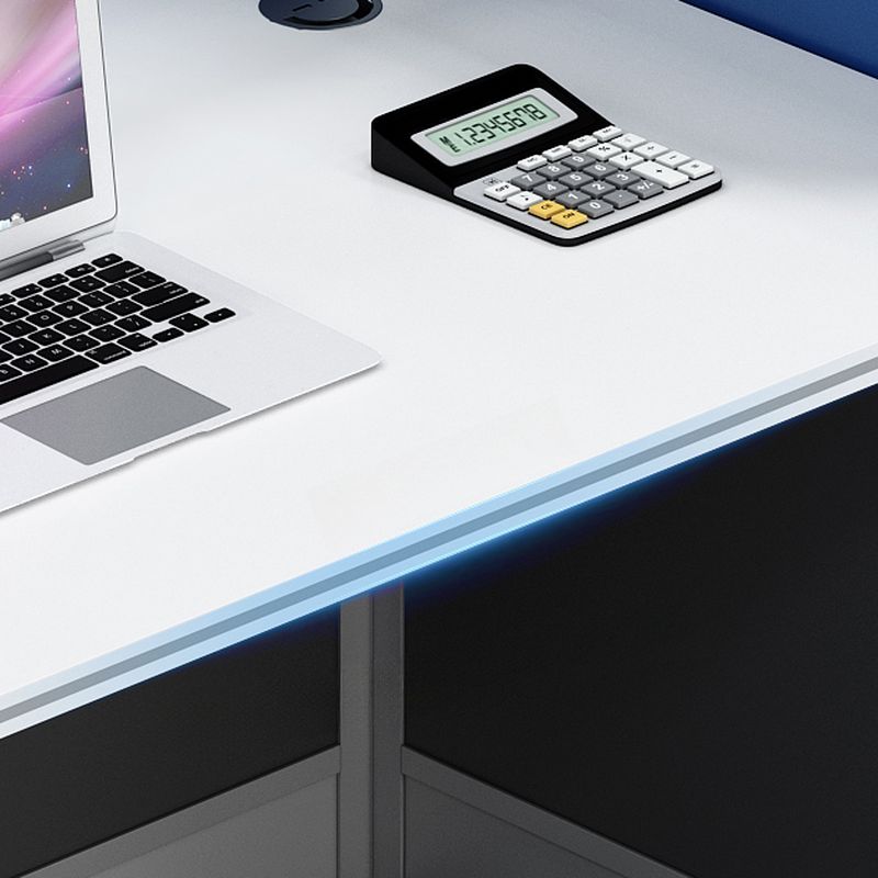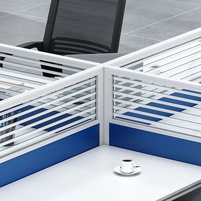 - Privacy-enhancing panels – White and blue partitions provide visual separation while maintaining open communication.