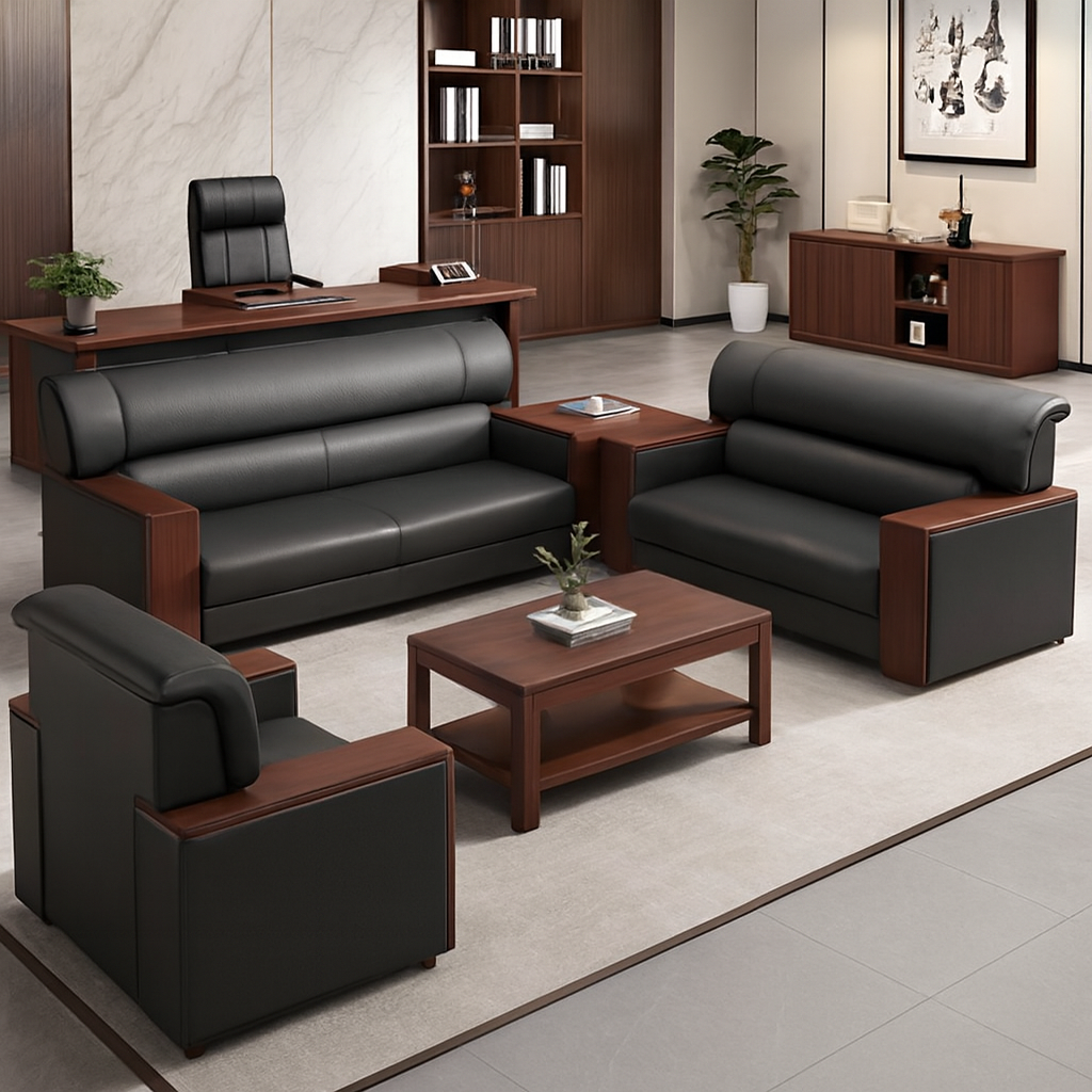Make a lasting impression with this luxurious executive lounge sofa set, crafted to elevate high-level offices, boardrooms, and reception areas. Featuring two sleek black leather sofas, a matching armchair, and refined wooden coffee tables(EXCLUDED), this ensemble blends authority with comfort in every detail. Whether you’re outfitting a CEO’s office, a law firm’s reception, or a director’s lounge, this set delivers the perfect balance of comfort, prestige, and professional style.