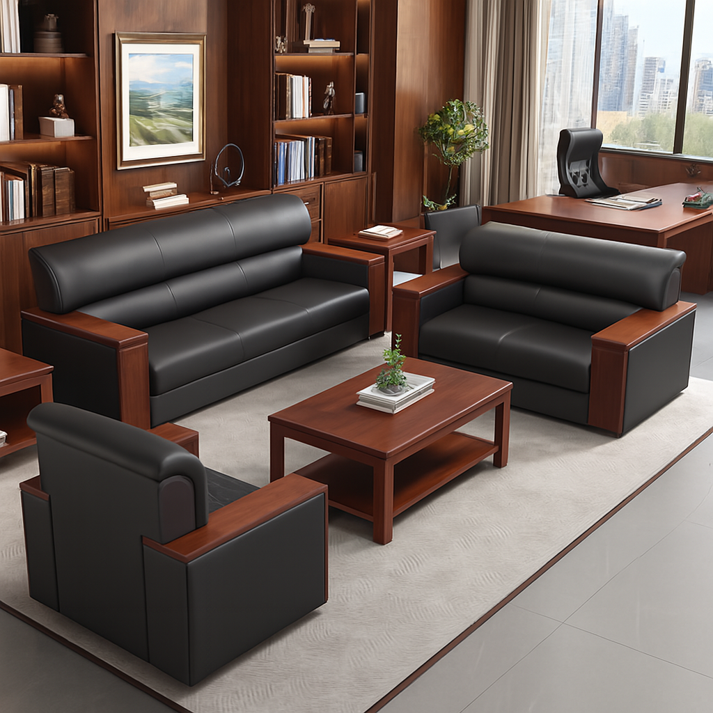 Craft a distinguished and serene meeting area or executive office with this premium living room sofa set. The solid black leather upholstery provides a sleek, professional look, while reddish wood accents add a touch of warmth and sophistication. Designed for both comfort and visual impact, this set includes a spacious three-seater and two matching armchairs, perfect for hosting clients or relaxing in style. Pair it with a mountain mural or soft lighting to create a space that feels both grounded and elevated.