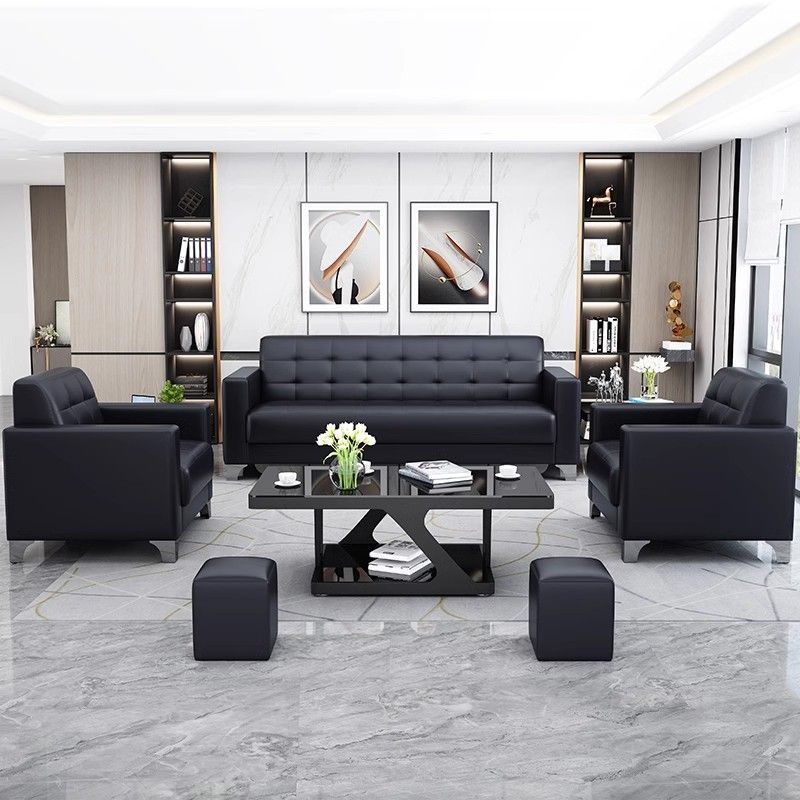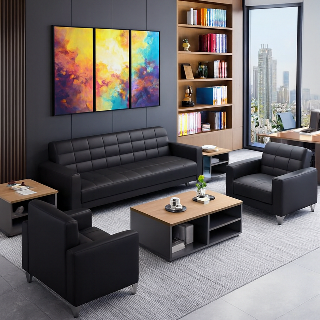 Transform your reception or lounge area into a statement of sophistication with this premium black leather seating ensemble. Featuring a sleek three-seater sofa and two matching armchairs, this set combines timeless design with executive comfort. The deep black upholstery, clean lines, and structured silhouette exude authority and professionalism, making it ideal for law firms, corporate offices, and upscale salons. Pair it with a minimalist coffee table or vibrant wall art to complete the look. This set doesn’t just furnish your space—it defines it.