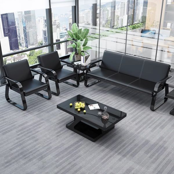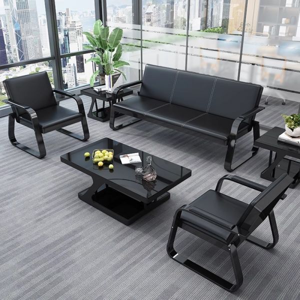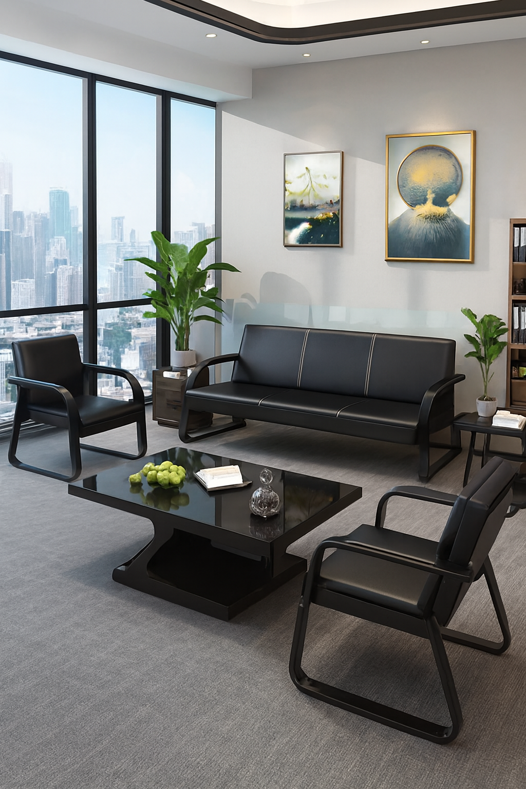 Make a lasting impression with this executive lounge set, designed to elevate your reception or waiting area with sleek modernity and quiet luxury. Featuring a black leather sofa, matching armchairs, and a minimalist coffee table, this ensemble blends comfort with commanding presence. With panoramic windows and subtle greenery, this setup invites calm, confidence, and conversation—perfect for welcoming clients or relaxing between meetings.