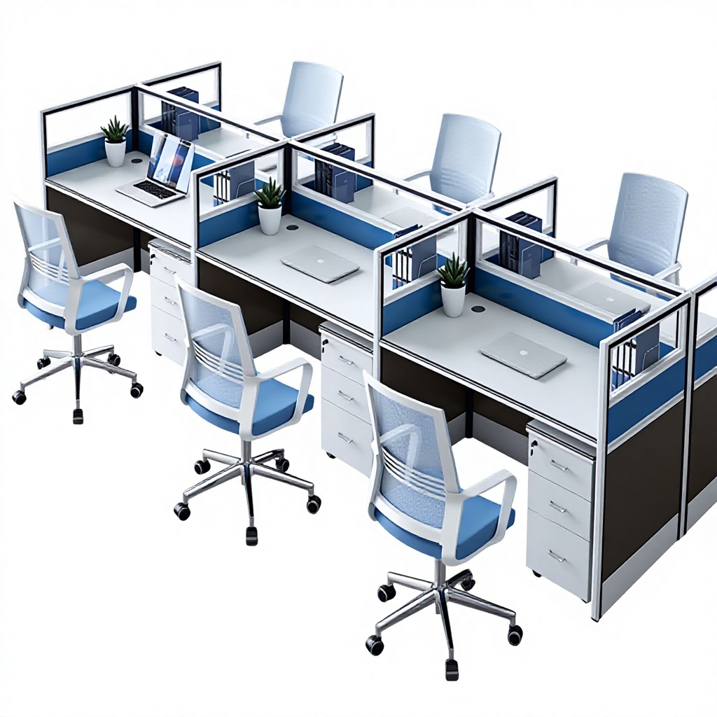 Ergonomic Blue-Accented Seating: (Optional Add-on) Perfectly paired with high-back mesh chairs that mirror the workstation’s clean white and blue color palette.
