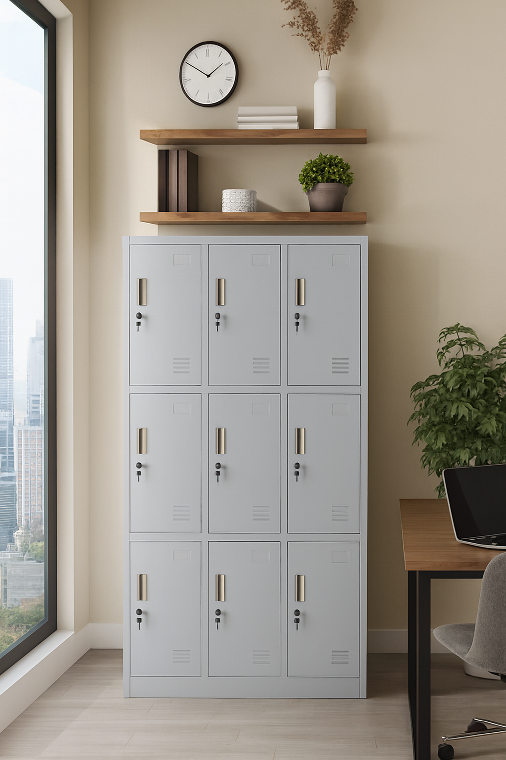 Streamline your storage with this heavy-duty 9-door metal locker cabinet, designed for high-traffic environments that demand durability and security. Ideal for schools, gyms, offices, and industrial settings. Whether you’re outfitting a school hallway or upgrading your workplace organization, this locker cabinet delivers reliable performance and professional appeal.