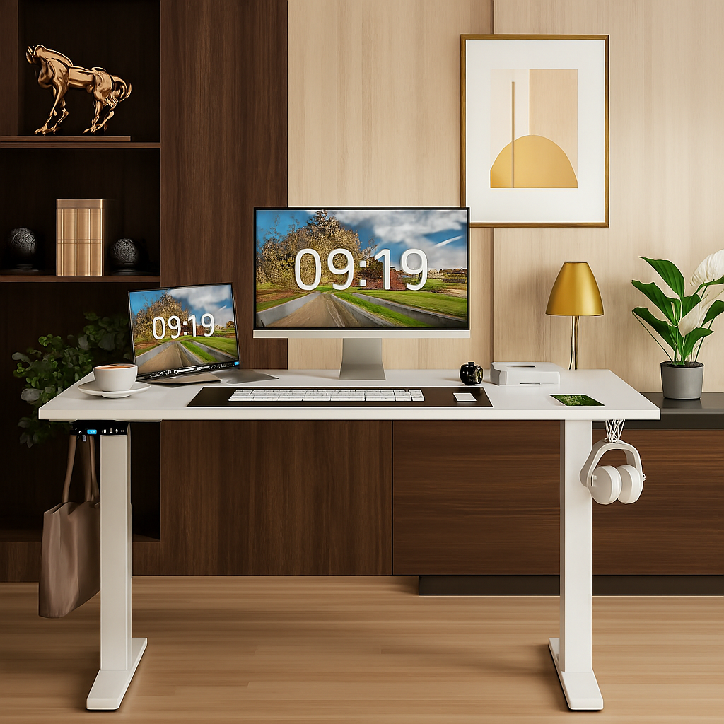 Elevate your workspace with this sleek, modern desk designed for professionals who value both style and functionality. Featuring a light oak surface paired with a crisp white frame, this height-adjustable workstation blends seamlessly into executive offices, home studies, and creative environments. Whether you’re powering through deadlines or curating a calm, productive atmosphere, this desk supports your flow. Perfect for professionals, institutions, and families seeking a refined workspace without compromising on authenticity.