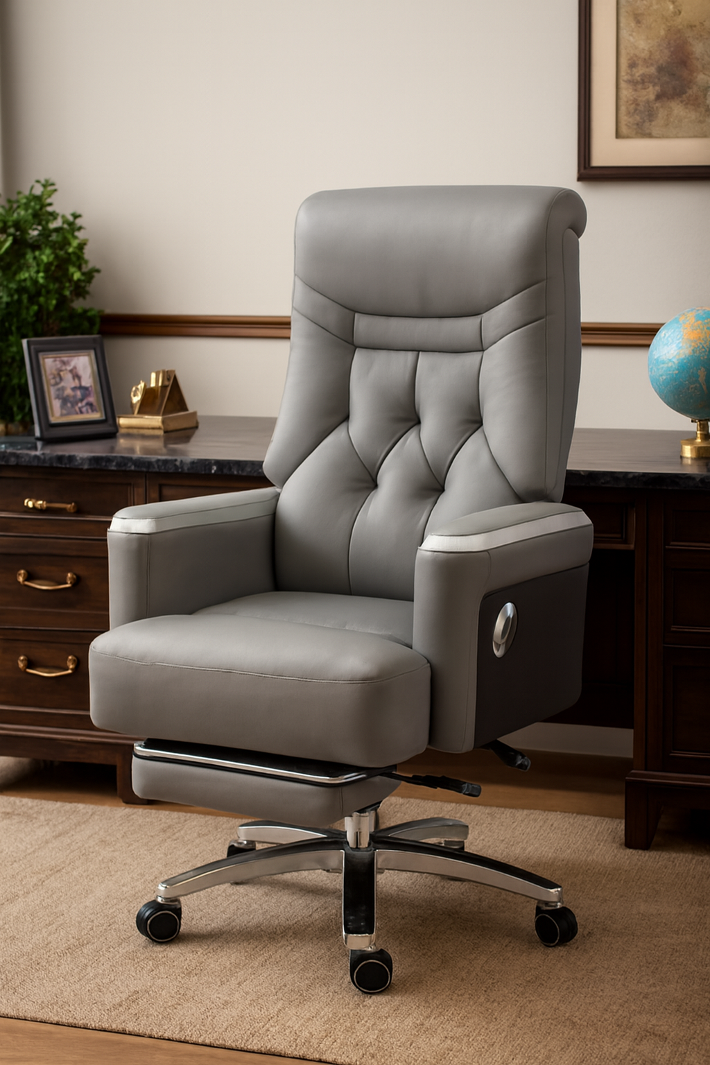 Redefine your workspace with this high-back ergonomic chair—crafted for professionals who demand both luxury and performance. Upholstered in elegant gray with a tufted backrest, it offers plush support and a sleek silhouette that complements executive offices, salons, and premium home setups. Whether you’re leading meetings or unwinding between tasks, this chair delivers comfort, style, and authority. A perfect centerpiece for workspaces that value both aesthetics and ergonomic excellence.