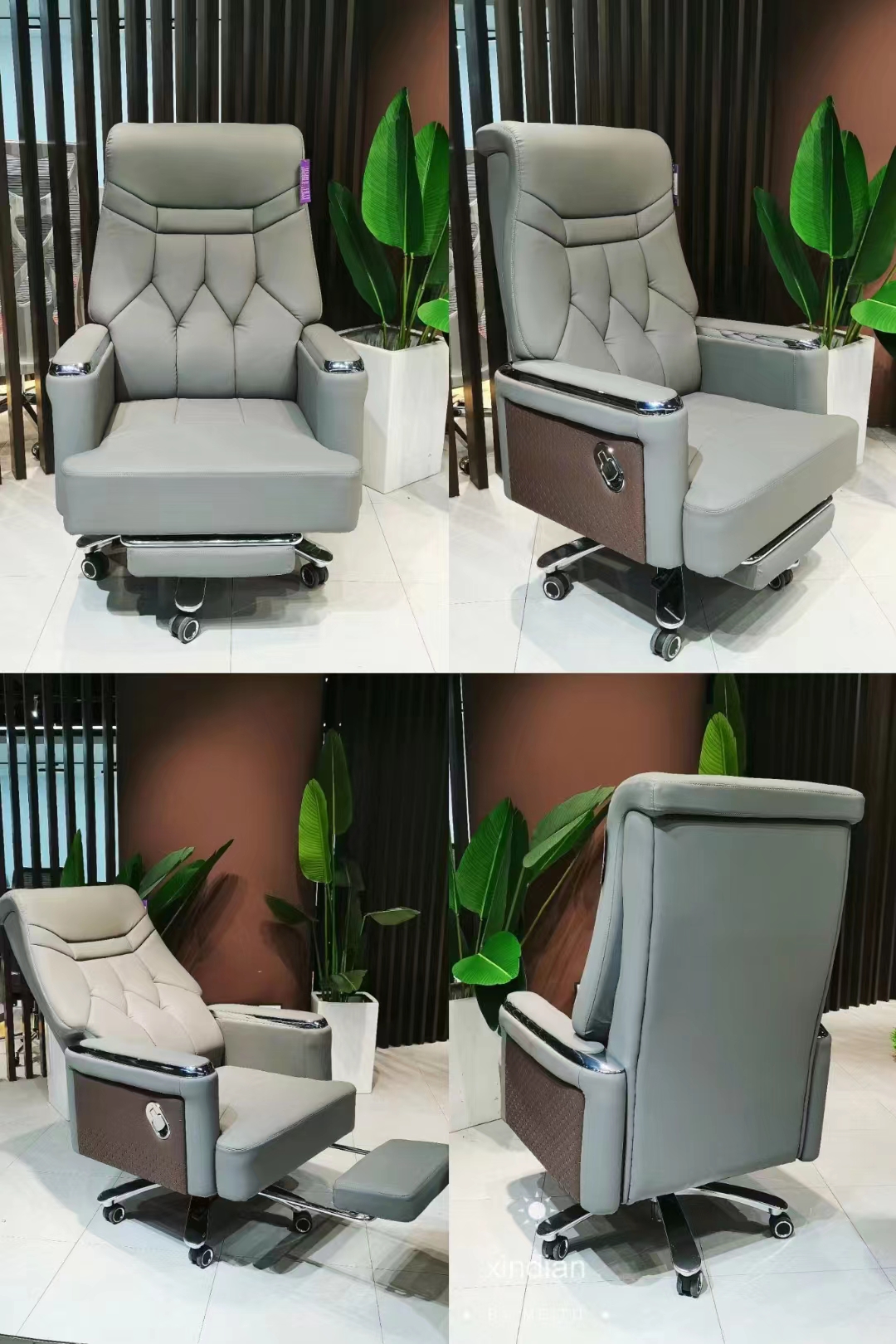 - Metallic-accented armrests and side lever for smooth reclining control