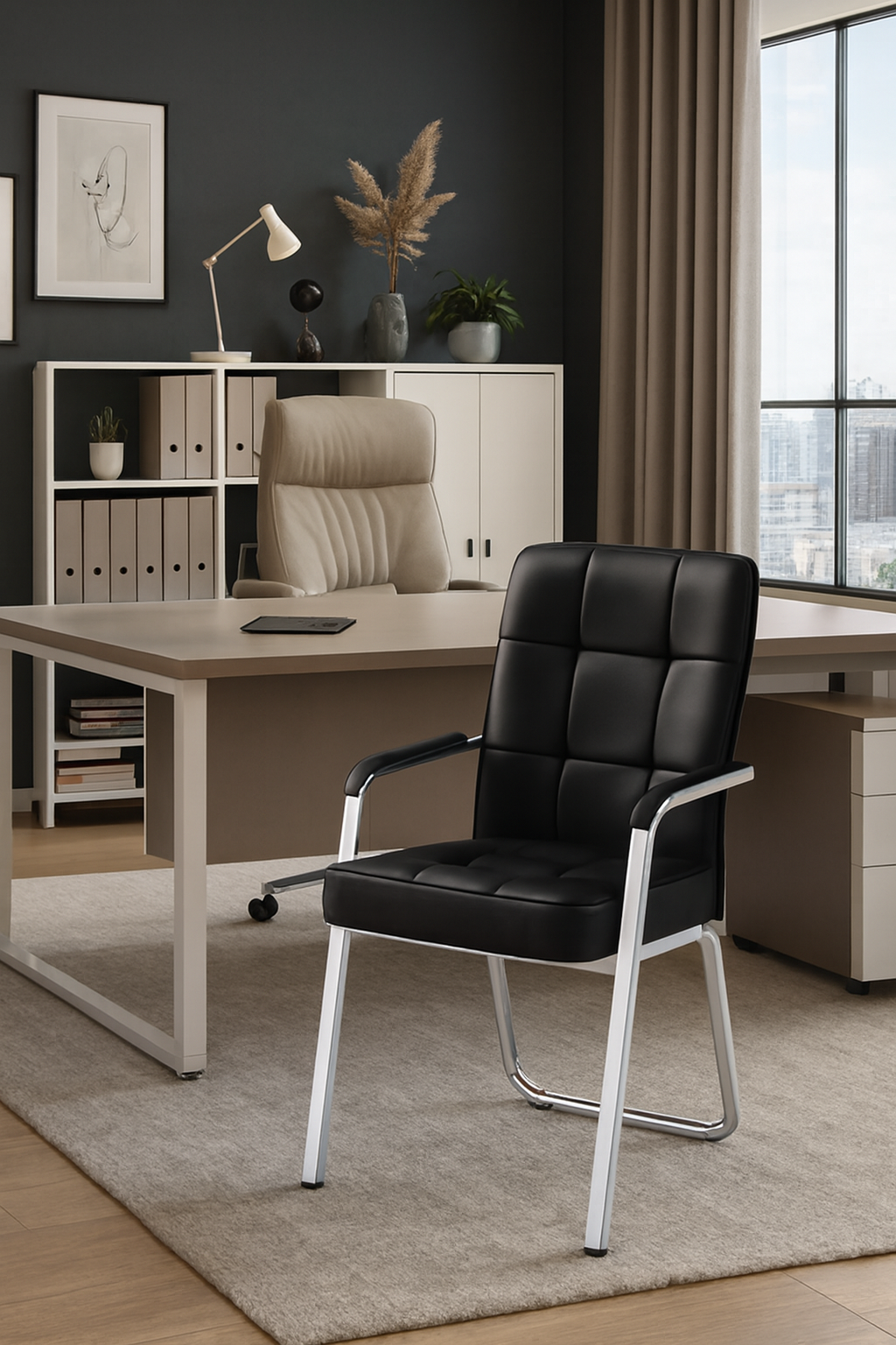 Upgrade your office’s guest experience with seating that speaks volumes about your brand. This sleek, mid-back guest chair is the perfect addition to conference rooms, reception areas, or collaborative workstations. Designed with a sophisticated black-and-chrome palette, it offers a crisp, modern aesthetic that effortlessly elevates any professional environment. Invest in quality seating that makes your clients and partners feel welcome.