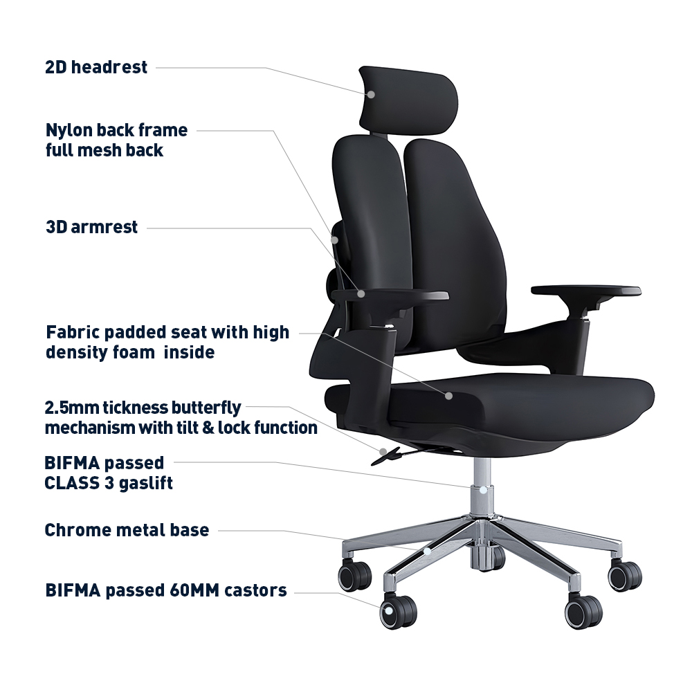 Experience the future of workplace wellness with the AeroFlex Pro. Engineered for high-performance individuals who spend long hours at their desks, this chair moves beyond standard seating to provide a “floating” support system that adapts to your body’s every movement. The hallmark of the AeroFlex Pro is its innovative Split-Panel Backrest. Unlike traditional solid chairs, these two independent “wings” pivot and flex to mirror the movement of your shoulder blades and spine. Whether you are leaning in to focus or reclining to take a call, the chair provides continuous, targeted pressure relief.