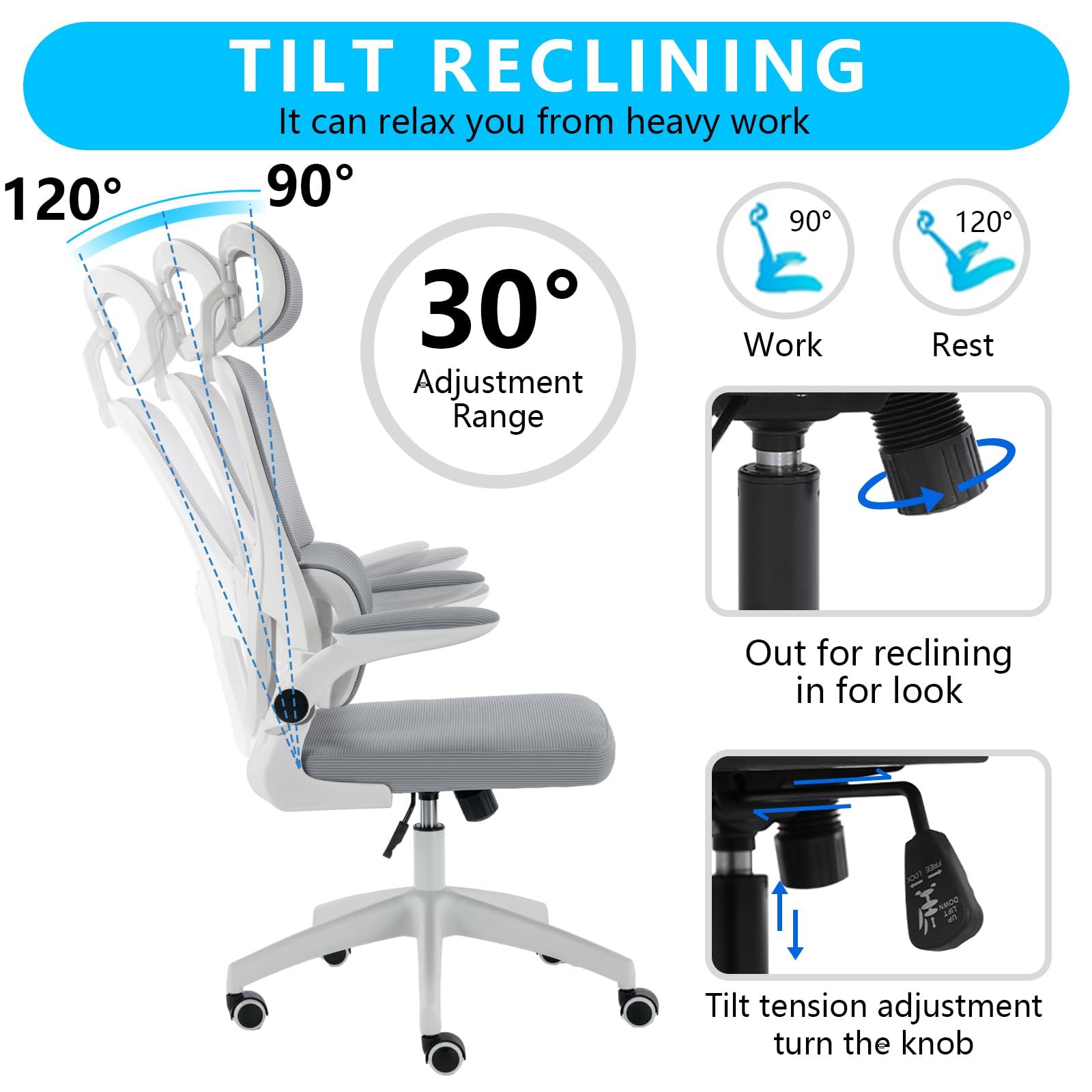 Height & Tilt Control: Find your sweet spot with a smooth pneumatic lift and reclining tension control.