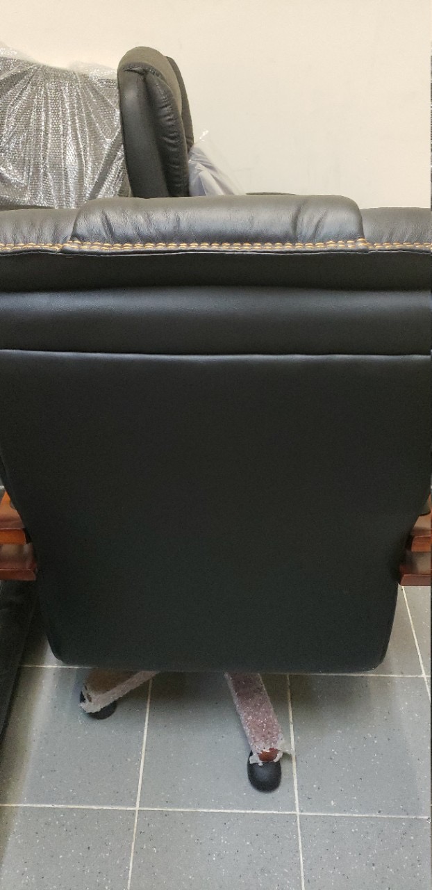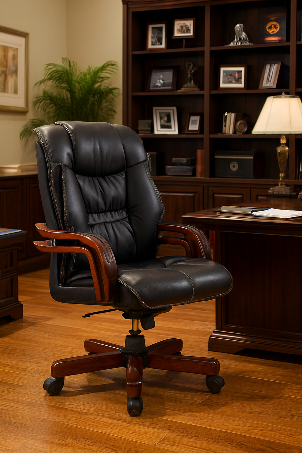 Command the room with this high-end black leather executive chair, designed for leaders who value sophistication and ergonomic excellence. With rich leather upholstery, sculpted wooden armrests, and a five-wheel wooden base, this chair anchors your office with timeless authority. Perfect for CEOs, directors, and professionals who want their workspace to reflect their ambition, this chair isn’t just furniture—it’s a statement of leadership.