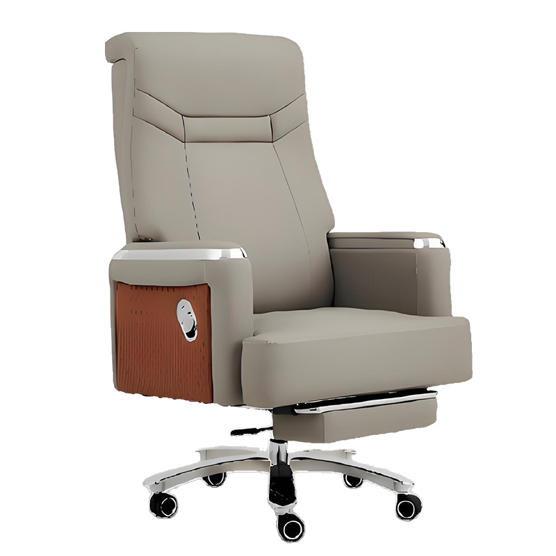 Architectural Mixed-Media Design: A stunning combination of buttery-soft dove grey upholstery, warm wood-grain side panels, and polished chrome accents. This chair doesn’t just sit in a room—it commands it.