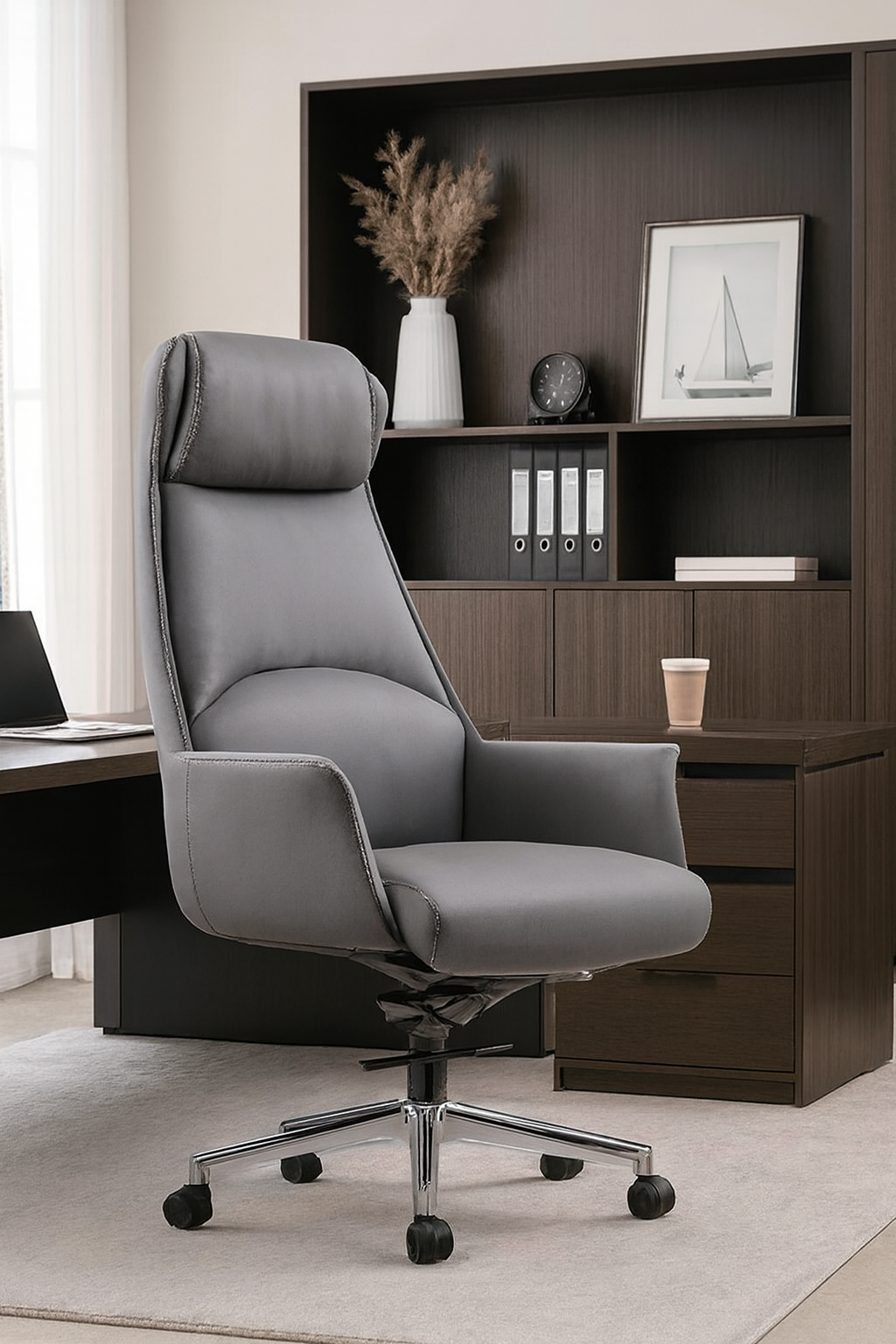 ​Experience the perfect intersection of executive authority and ergonomic luxury. This high-back office chair is designed for leaders who spend long hours at their desks and demand both peak performance and sophisticated style. With its sleek gray upholstery and polished chrome accents, it transforms any office into a contemporary command center. ​Upgrade your seating experience today and feel the difference that true ergonomic design makes.