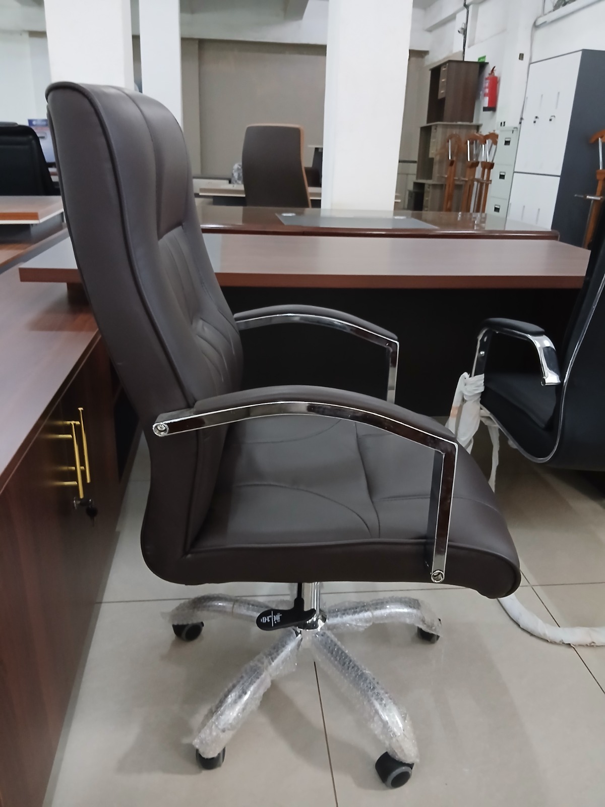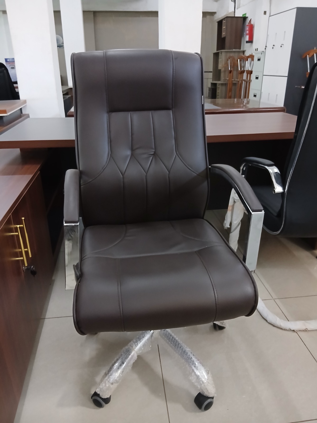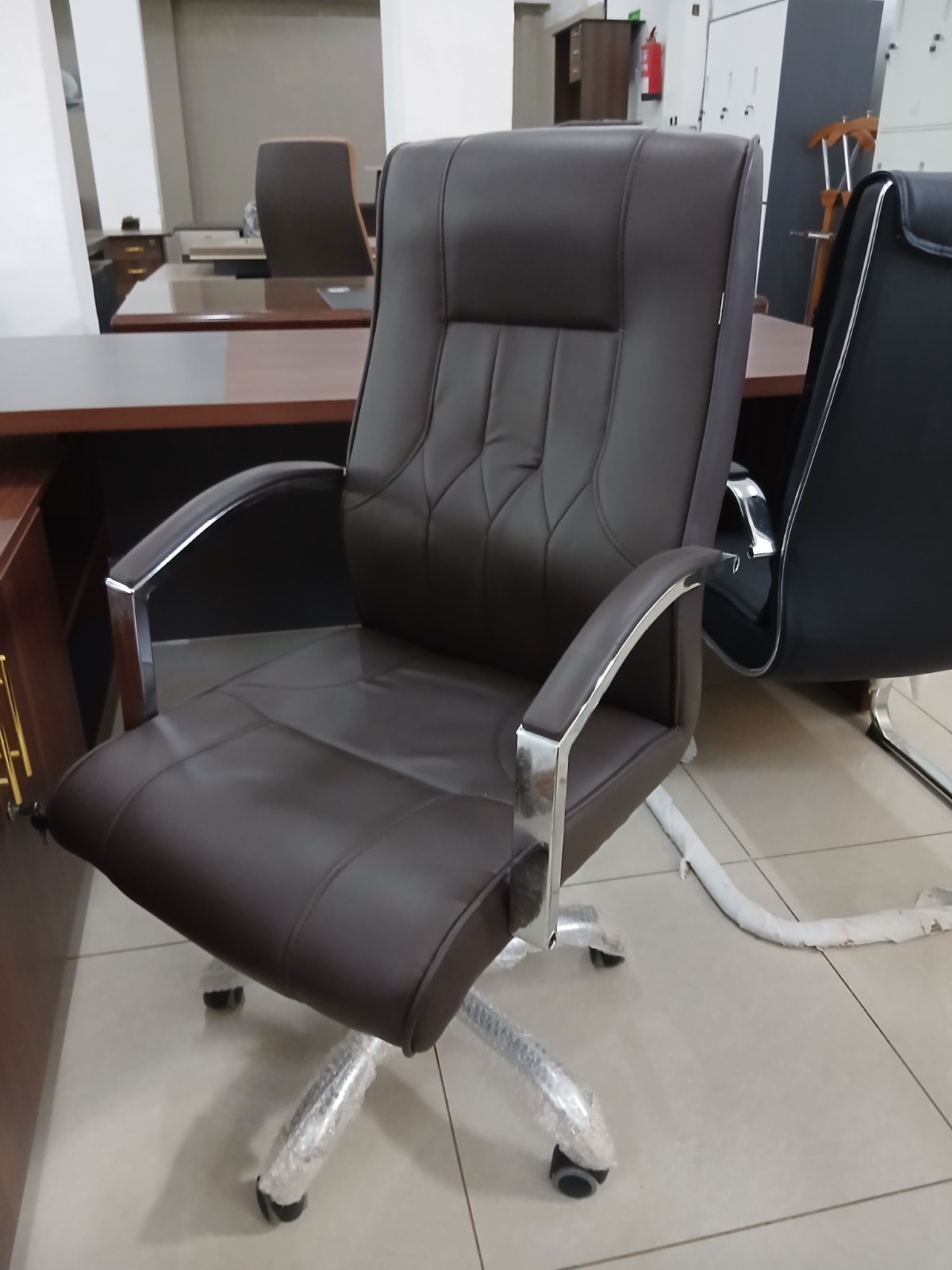 Polished Chrome Accents: The striking contrast between the dark upholstery and the high-shine chrome armrests and base adds a sleek, modern flair to any executive suite.