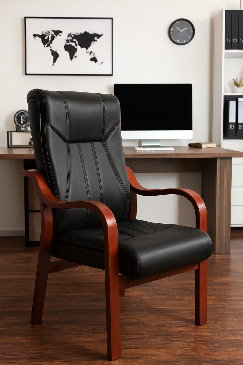 Make a powerful impression with our Black Leather Executive Chair with Red Wood Accents—a commanding blend of classic luxury and modern functionality. Designed for high-level offices and refined workspaces. This chair isn’t just seating—it’s a symbol of authority, taste, and professional excellence.