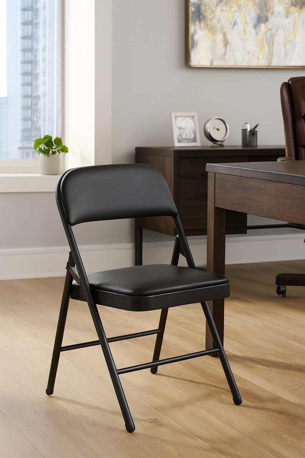 The FlexFold Padded Office Chair is your go-to solution for adaptable seating in dynamic workspaces. With a sleek black metal frame, cushioned seat and backrest, and a foldable design, it offers both comfort and convenience—perfect for meetings, guest seating, or compact home offices. Set in a naturally lit office with city views and tasteful décor, this chair blends utility with elegance—making it a smart choice for professionals who value both form and function.