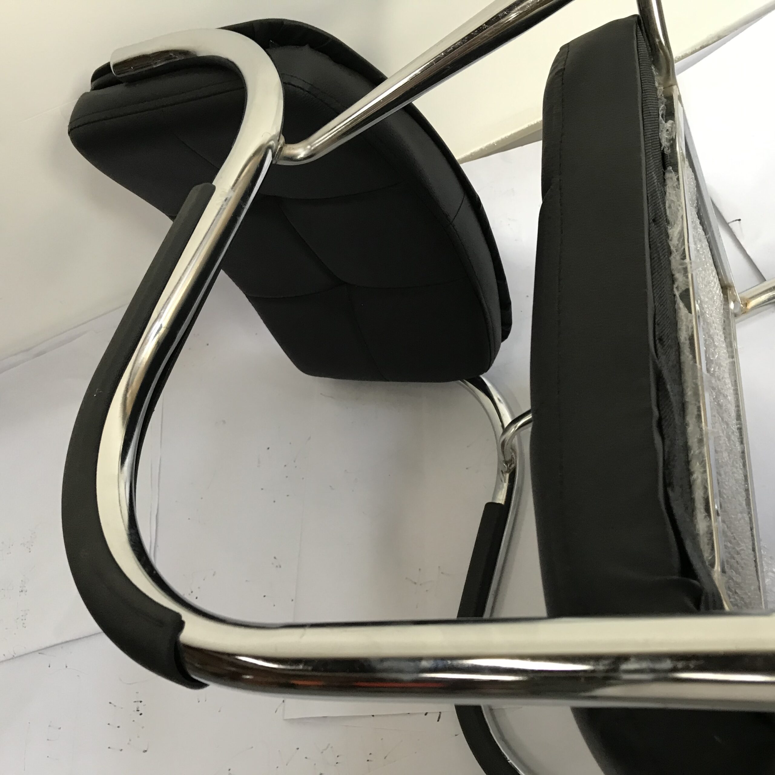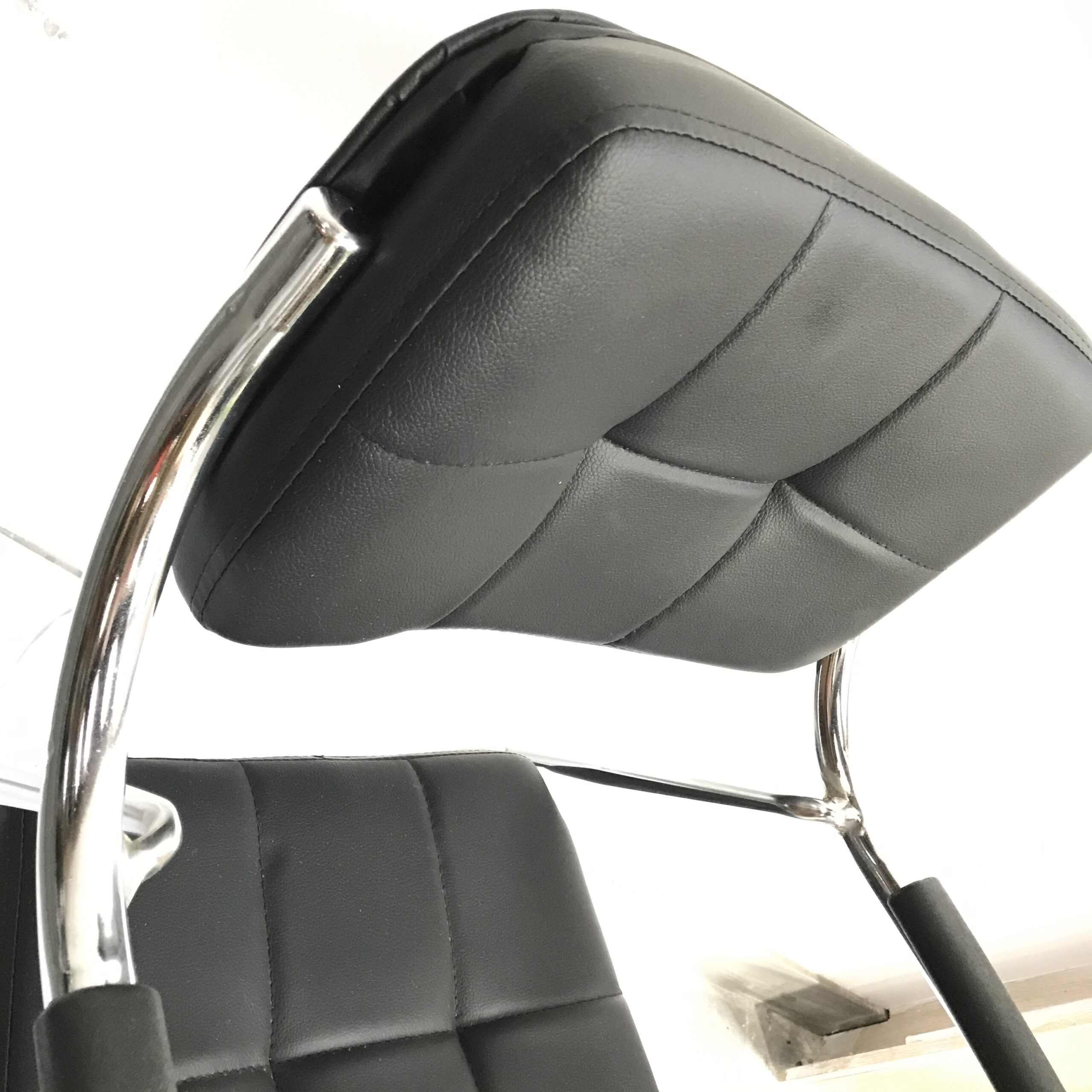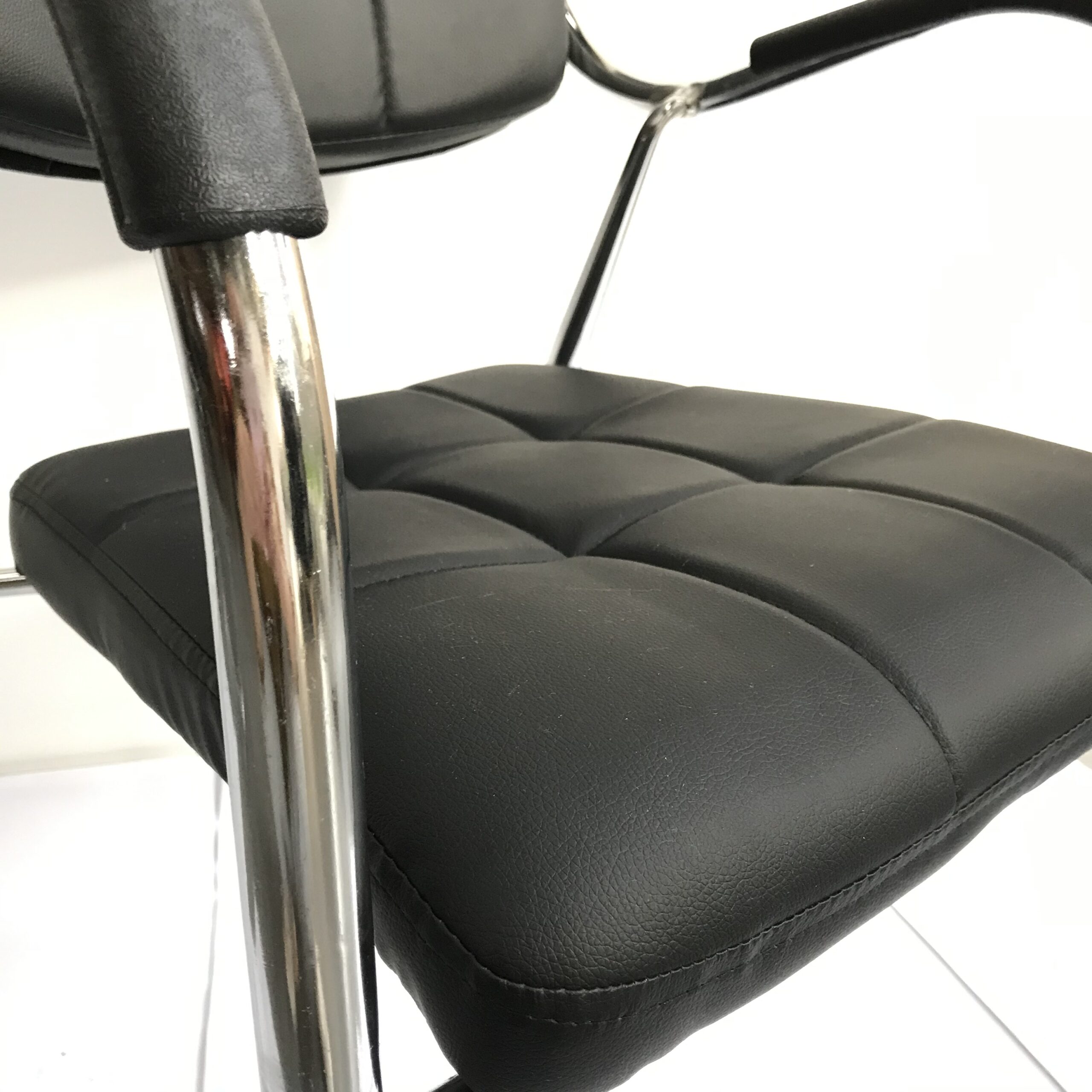 Upgrade your workspace or lounge with this modern leather and chrome chair, designed to deliver both comfort and style. Upholstered in sleek black faux leather with a square tufted pattern, it offers a refined look that complements any professional or home setting. This chair is more than seating—it’s a statement of taste and professionalism, offering the perfect balance of comfort and design.