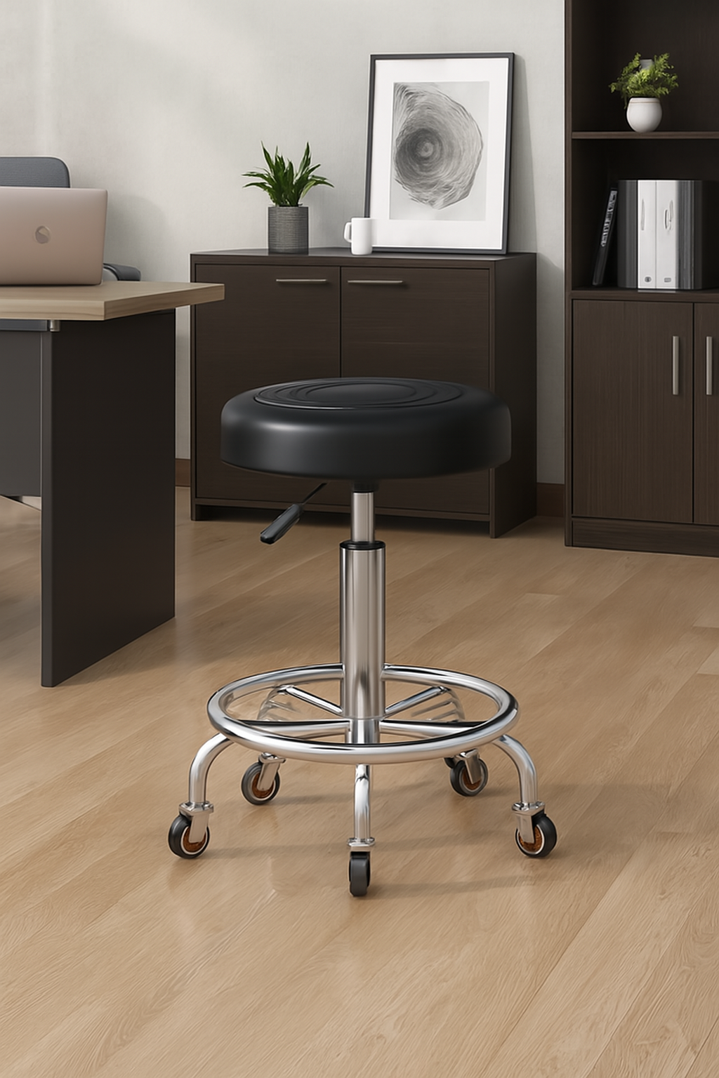 Designed for dynamic environments, this sleek black swivel stool combines mobility, comfort, and minimalist style. Whether you’re outfitting a clinic, salon, studio, or executive office, its compact form and professional finish make it a versatile essential. Perfect for professionals who value clean design and practical performance. This stool fits seamlessly into modern interiors while supporting active, on-the-go tasks.