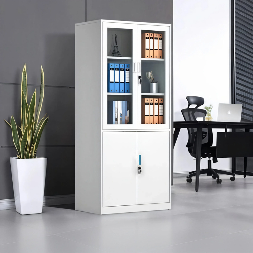 Hybrid Display & Privacy: Featuring a unique split-level design, the upper section boasts tempered glass doors to showcase your library or awards, while the lower steel cabinets keep sensitive documents and supplies tucked away and out of sight.