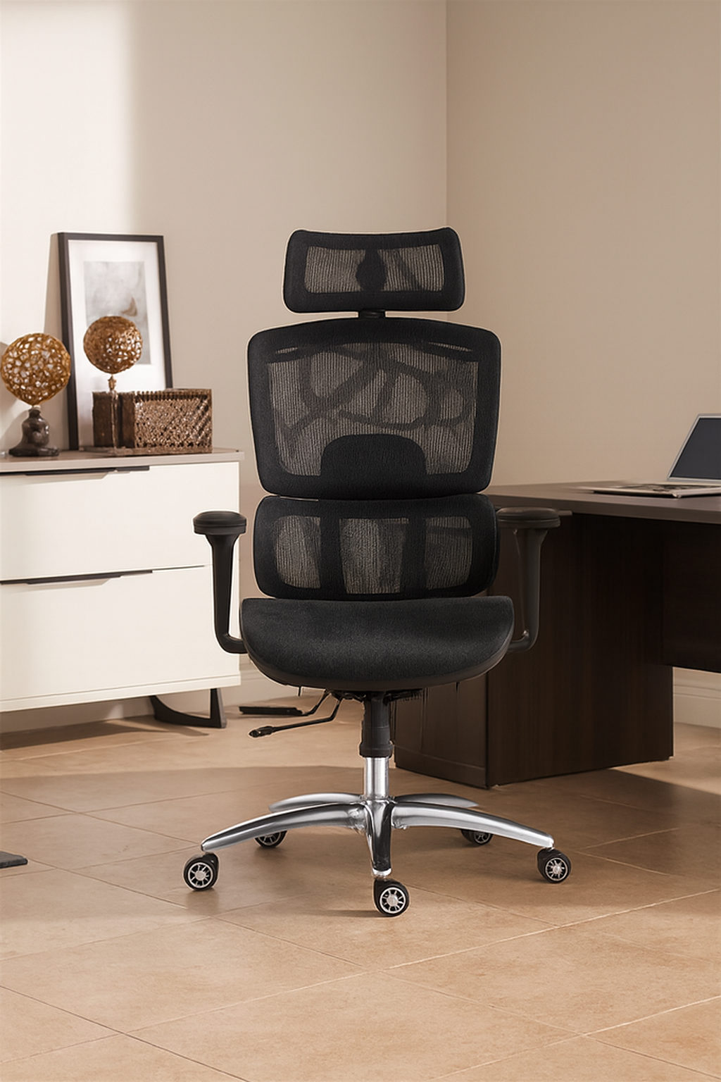 Upgrade your workspace with this high-performance ergonomic office chair, engineered to support long hours of focused productivity. Featuring a breathable mesh back with segmented support zones—including headrest, upper back, and lumbar reinforcement—this chair adapts to your posture for all-day comfort. Its cushioned seat, adjustable armrests, and smooth-glide chrome base offer a perfect blend of mobility and stability. Whether you’re working from home or outfitting a professional office, this chair delivers sleek design and serious support.